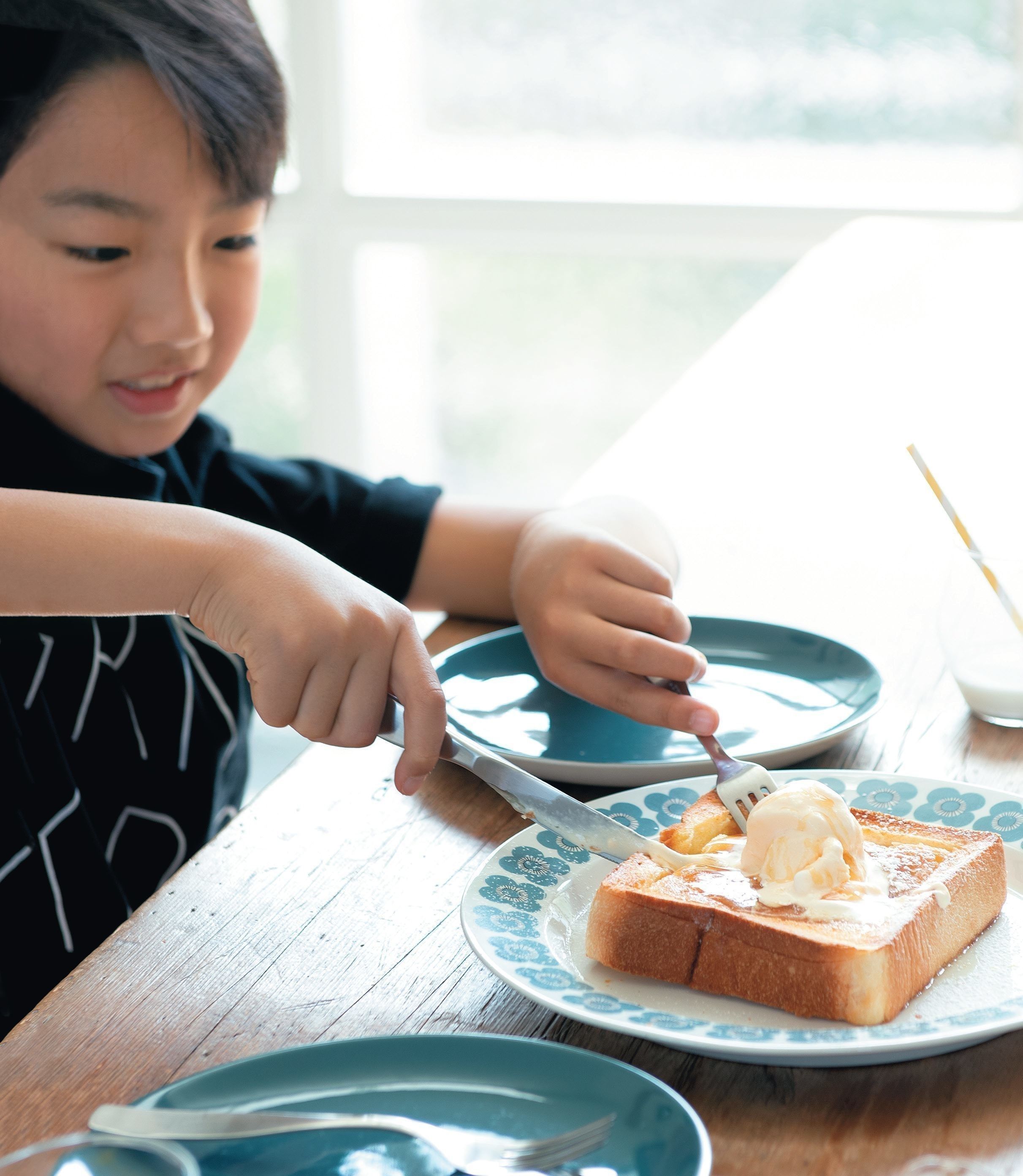 食パンは切り目を入れてトースターでこんがりと焼き、バターを塗ってはちみつ、アイスを好みでのせ、粉砂糖をふる。