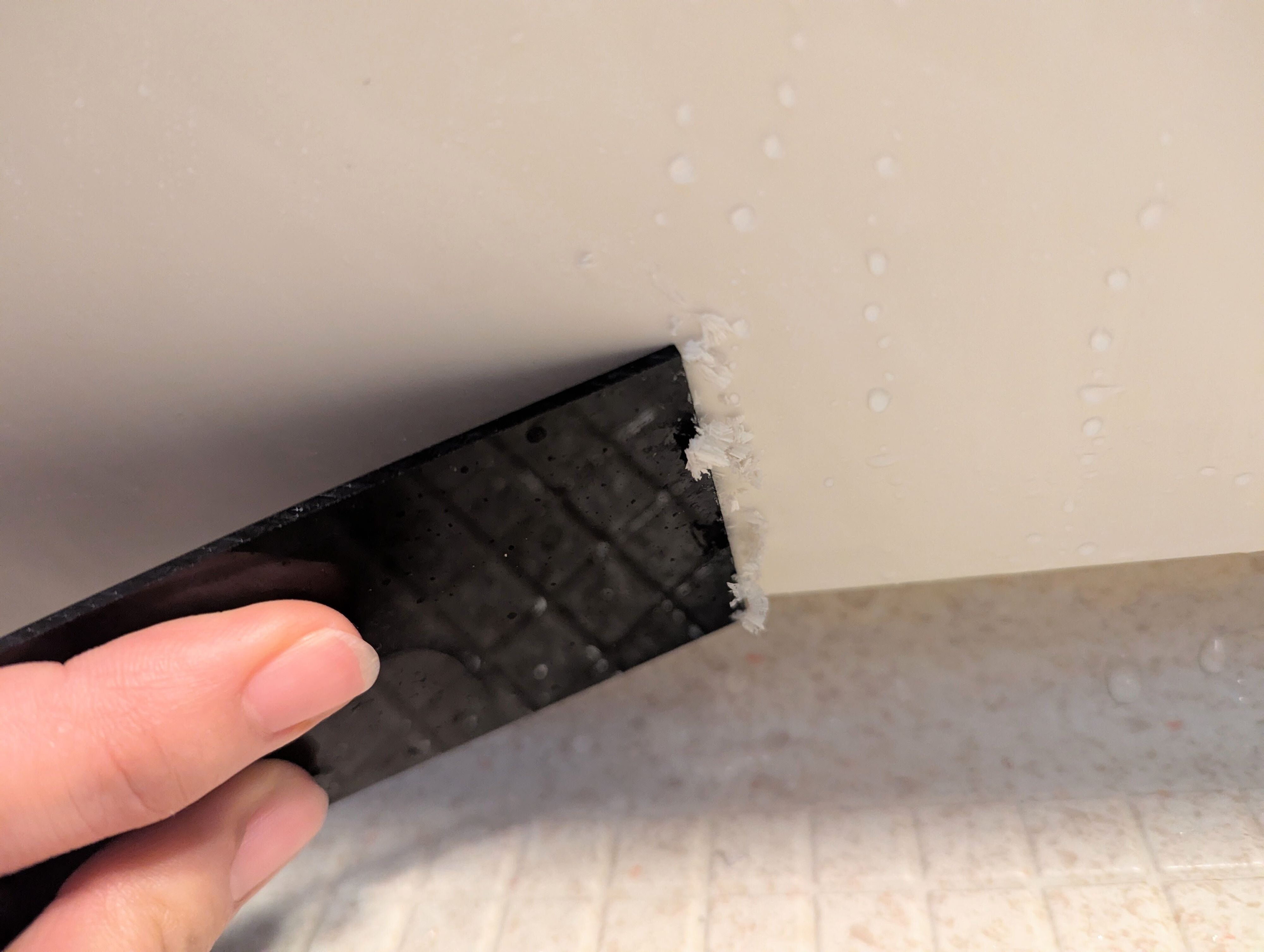 使い方はいたって簡単。気になる箇所を軽くこするだけで、洗剤でもなかなか落ちない分厚い石けんカスをこそげ落とすことができます(黒色や光沢のある素材に使うと、キズが目立つことがあるので要注意)。