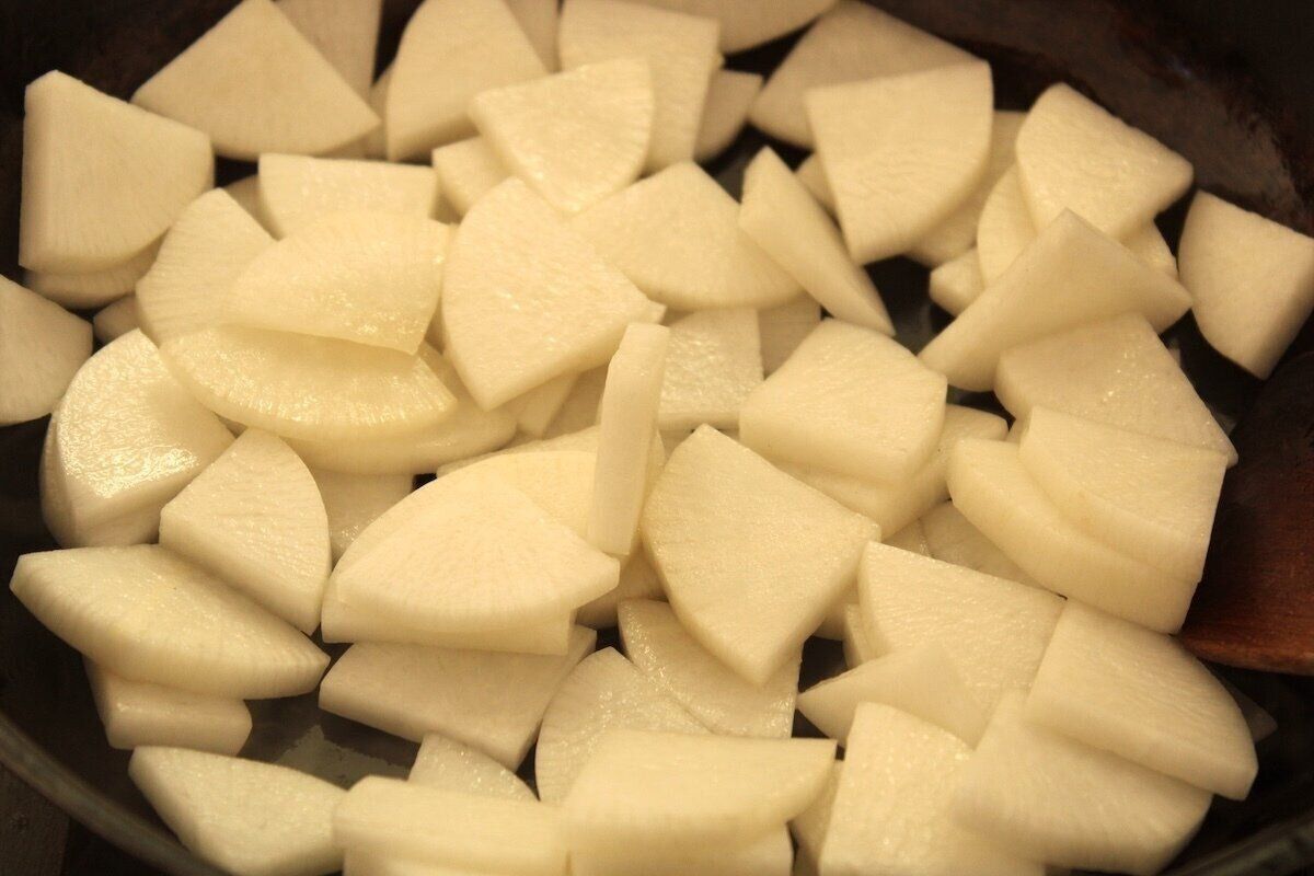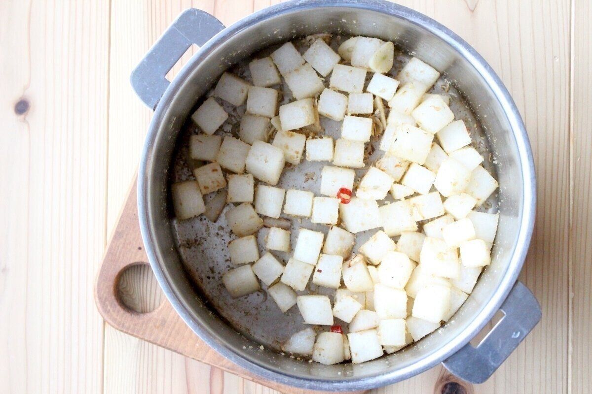 2.フライパンを熱して菜種油を入れ、弱火にして大根、にんにく、生姜、ネギを加えて大根がすきとおるまで木べらなどで炒める。