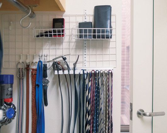 ベルトや財布などの小物は、クローゼットの壁面が指定席。夫と一緒にグッズを選び、差し込む、引っ掛けるなど片手で戻せるものを活用
