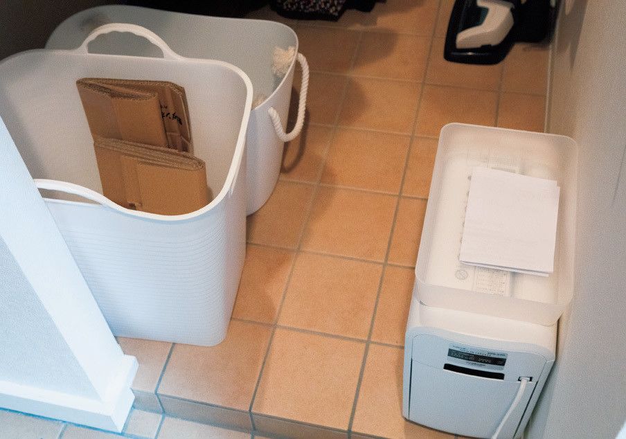 DMや郵便物は玄関で開封し、「要・不要」を即断。不要なものはシュレッダー上のケースに一時置きを。宅配便などの箱もすぐ解体し、資源ごみ用のケースへ