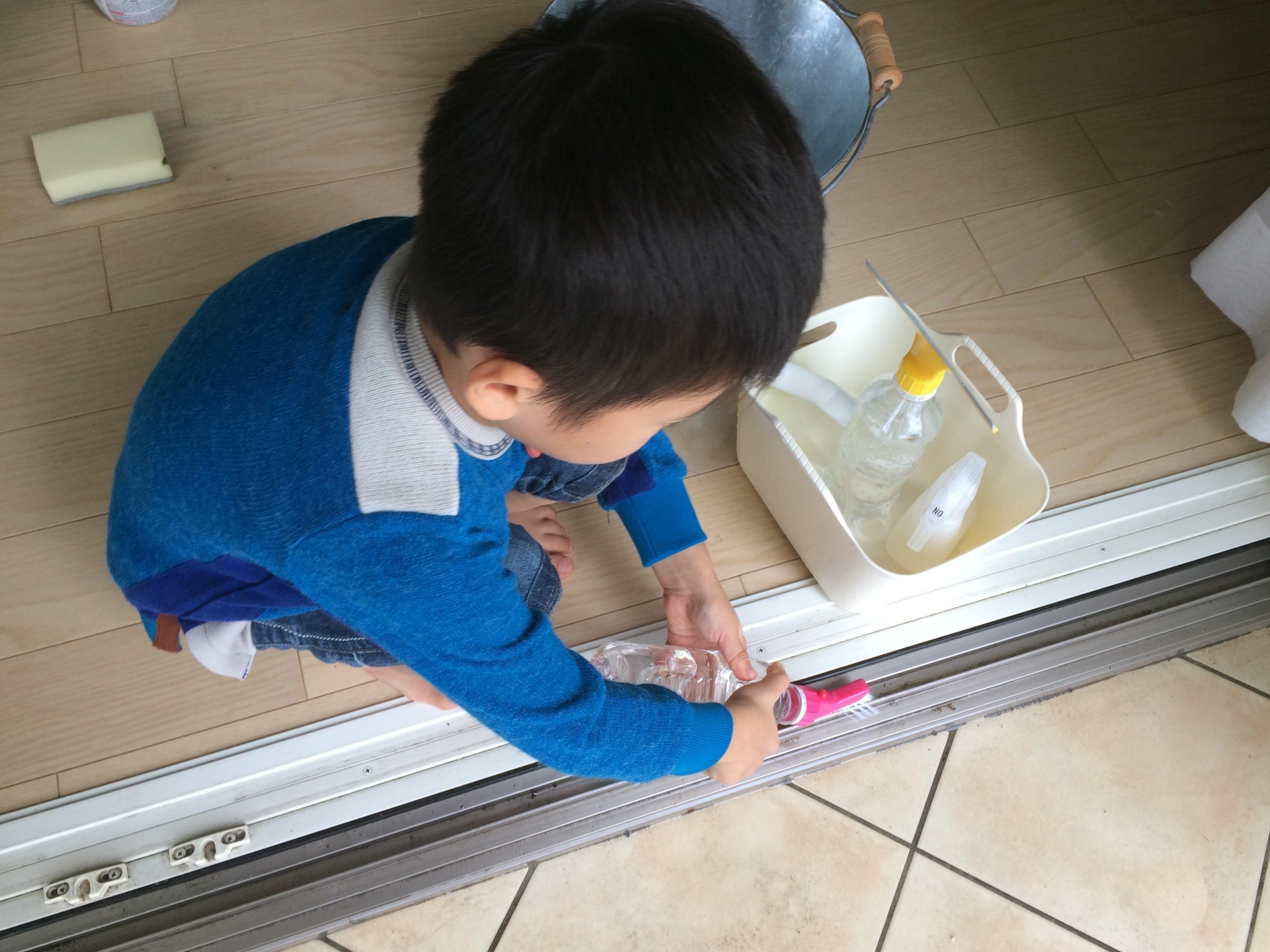 水を入れたボトルにこのアイテムを設置して、お掃除スタート。溝の間に水を流しながらブラシ掃除ができます。子どもって水掃除が大好き。お手伝いアイテムとしては抜群です。