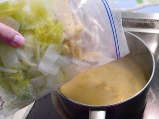 みい太さんは、ジッパー付きポリ袋でお味噌汁セットを作っています。ジッパー付きポリ袋の中に、お味噌汁1回分の白菜と油揚げ、しめじを入れて冷凍保存。食べるときに鍋に投入すれば、5分でお味噌汁が完成!めんつゆで煮て卵で閉じれば、煮びたしにも♪たくさん作っておくと朝のバタバタ解消に役立ちそうですね。