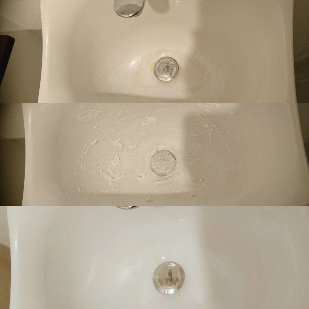 オキシクリーンではなく日本版オキシこと”オキシウォッシュ”を、チョイスしたのはサンキュ!ブロガーかのさん。のオキシウォッシュをトイレの手洗いにペーストするだけで、こんなにも色が変わっています!