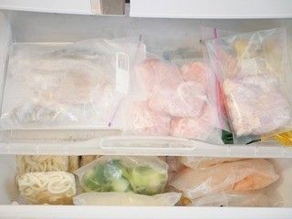 あっちゃんさんは、冷凍庫に肉やカットした野菜、きのこやチーズなどを小分けにして収納しています。冷凍庫は食品同士が保冷材の役割を果たすので、ある程度は詰めこんでも問題ないのだとか。1食分ずつキレイに並べて収納することで、取り出すときにわかりやすく、料理の時短にもつながりますね。
