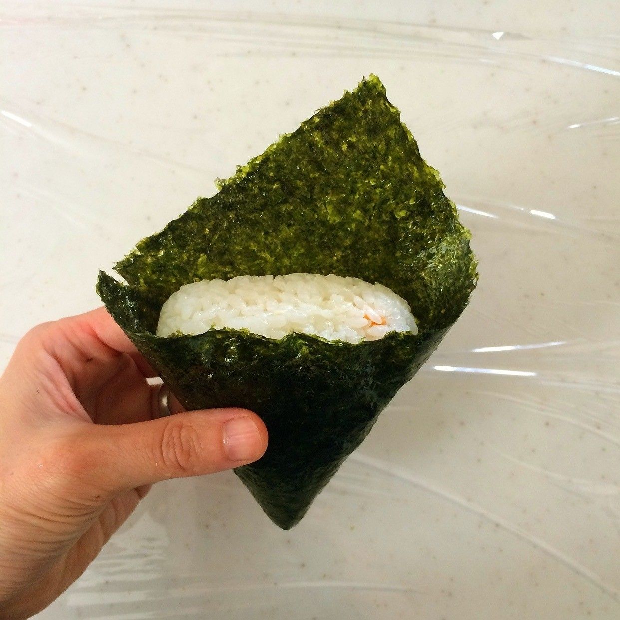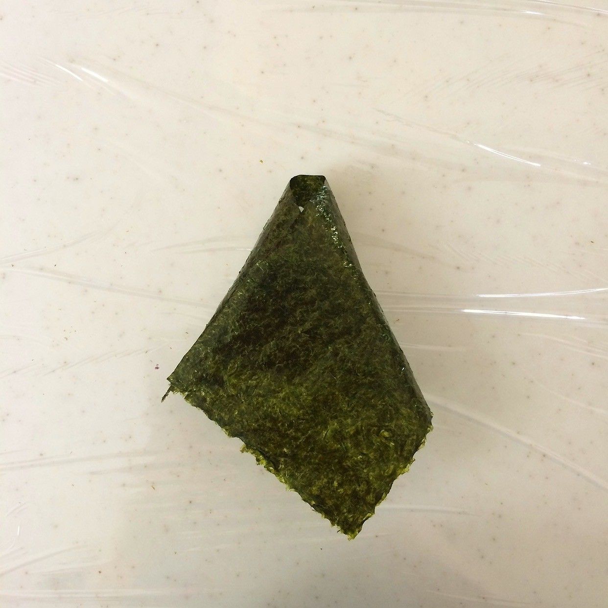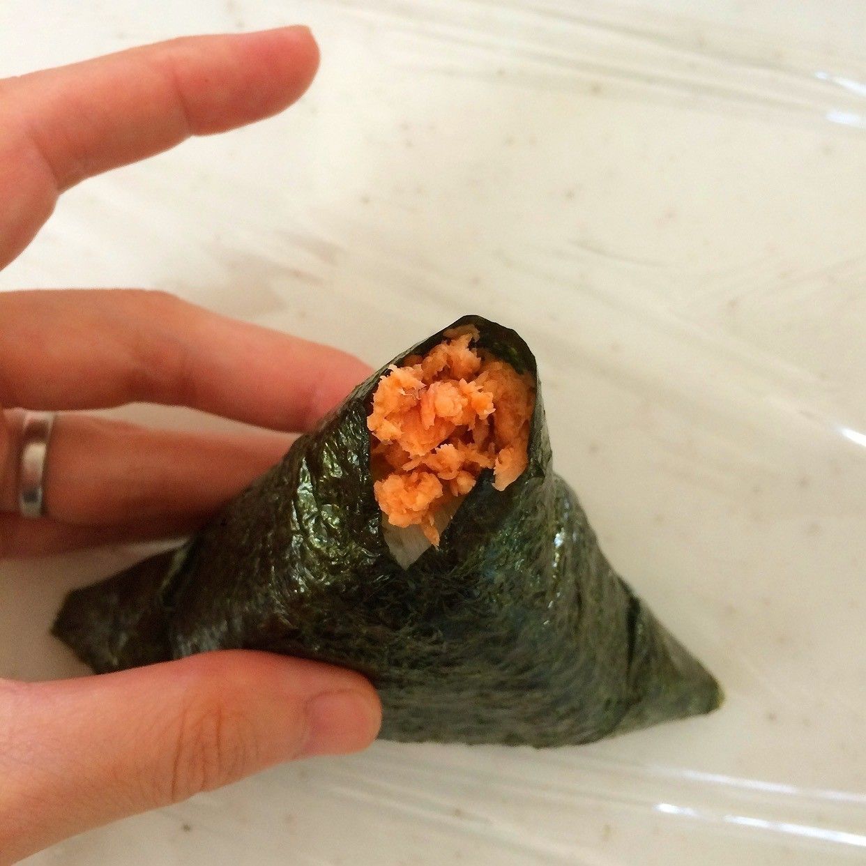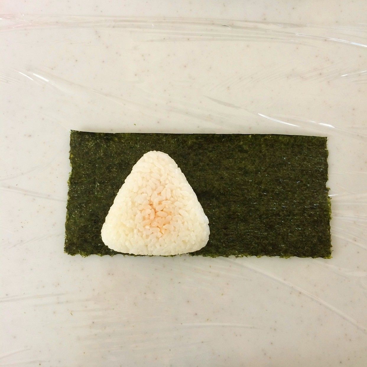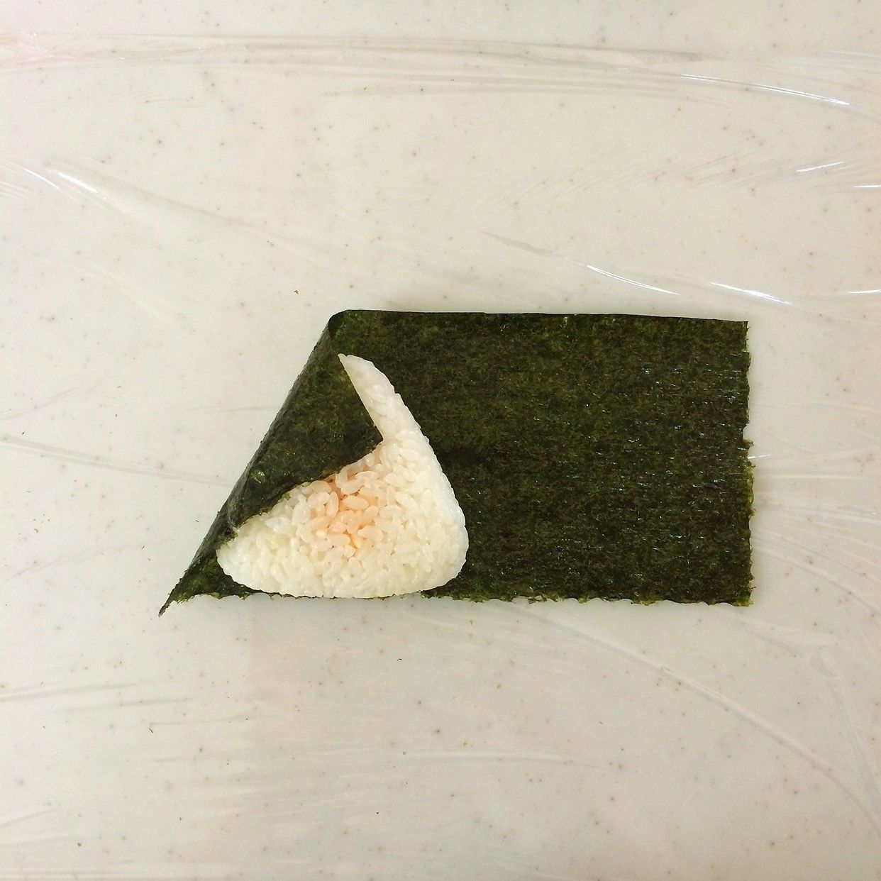 頂点部分に余白ができるので、そこにおむすびの具材を乗っけておくと、何のおむすびかが一目瞭然です。この巻き方をすることで中身がこぼれにくくなり、子どもの食べこぼしも減ったそうです。