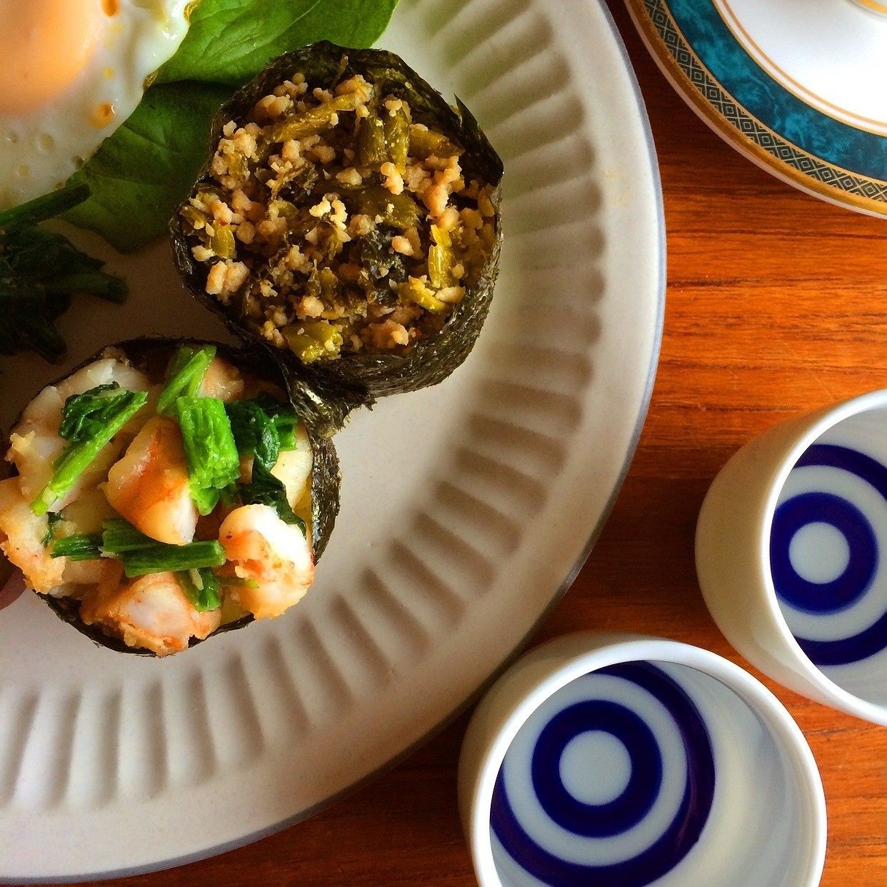 おちょこを使って簡単にかわいい形のおむすびが作れます。軍艦巻きのように海苔を一周させ常備菜をのっけただけでも子どもが喜ぶ一品になるそうです。この巻き方なら時間がないときにものっけるだけですので気軽に作れそうですね。