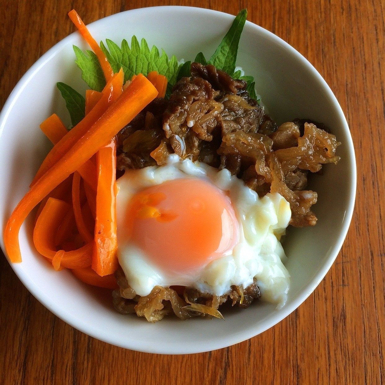 サンキュ!ブロガー野口ゆかさんは、常備菜ののっけ丼で簡単に。常備菜で作っていた牛肉のしぐれ煮と人参のナムルを具材に半熟卵の目玉焼きをオン。目玉焼きもトースターで作ると火を使わずに済むそうですよ。