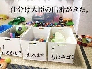 2人の子どもがいるcomayoさん宅では、不定期におもちゃの片付け作業も開催!家中のおもちゃを床に広げて、使っているもの、いるかもしれないもの、ほかのおうちに譲るもの、捨てるものに仕分けしていきます。おもちゃで遊びつつ、捨てる前の最終チェックもできるので、子どもにとってもいいアイデアですね。