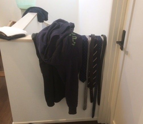 「スーツとワイシャツはちゃんとクローゼットにしまうのに、ネクタイとパジャマ(中央の黒い物体)は、なぜか寝室わきの階段手すりに掛ける夫……」(福さん)。帰宅後の服、ついあちこちにかけがちですよね。こんな困ったクセに中山先生はこうアドバイス。「慌ただしい帰宅後は“ちょい置き”の頻発タイム。衣類のほか、バッグや手荷物などあちこち置くクセがある人は玄関からの通り道にちゃんと「置き場」を設けて。帰宅後、すぐしまえる場所をつくることが大切です」(中山先生)