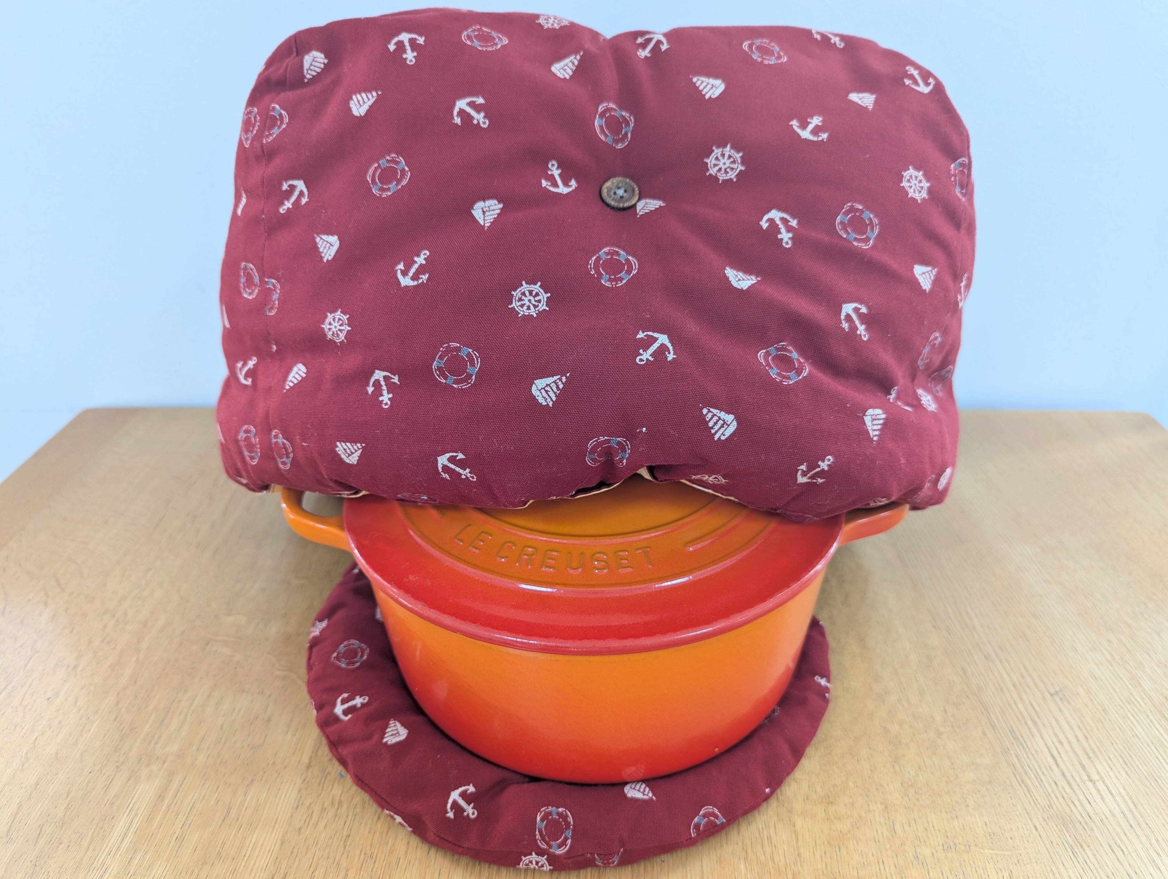「全国友の会」で企画・販売されている鍋帽子は、27cmの両手鍋まで対応しているので、ほとんどの鍋がすっぽり収まります。お値段も3,500円と、保温調理用の鍋を買うよりずっとお手頃。