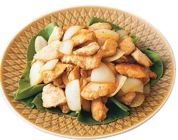 鶏胸肉2枚 玉ねぎ1個 オイマヨ/鶏肉はそぎ切りにしてオイマヨとともに袋でもむ。初めに肉を炒め、さらに一口大に切った玉ねぎと炒め合わせる。