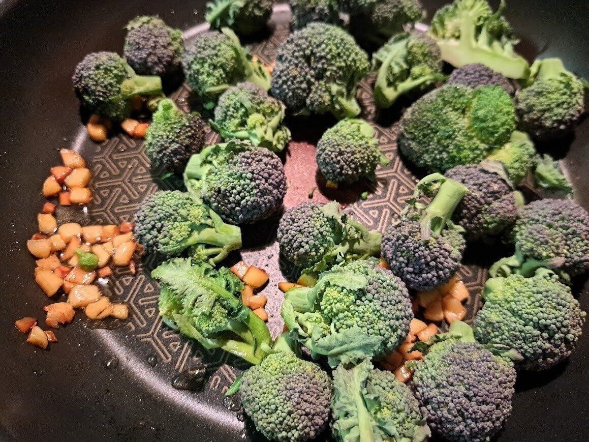 フライパンに、にんにくのみじん切りを入れて茶色になるくらいまでしっかり炒めてから、ブロッコリーを入れて、炒めます。その際、最初に大さじ2杯くらいの水を入れて、蒸し焼きにすると早く仕上げることができるので、おすすめです。