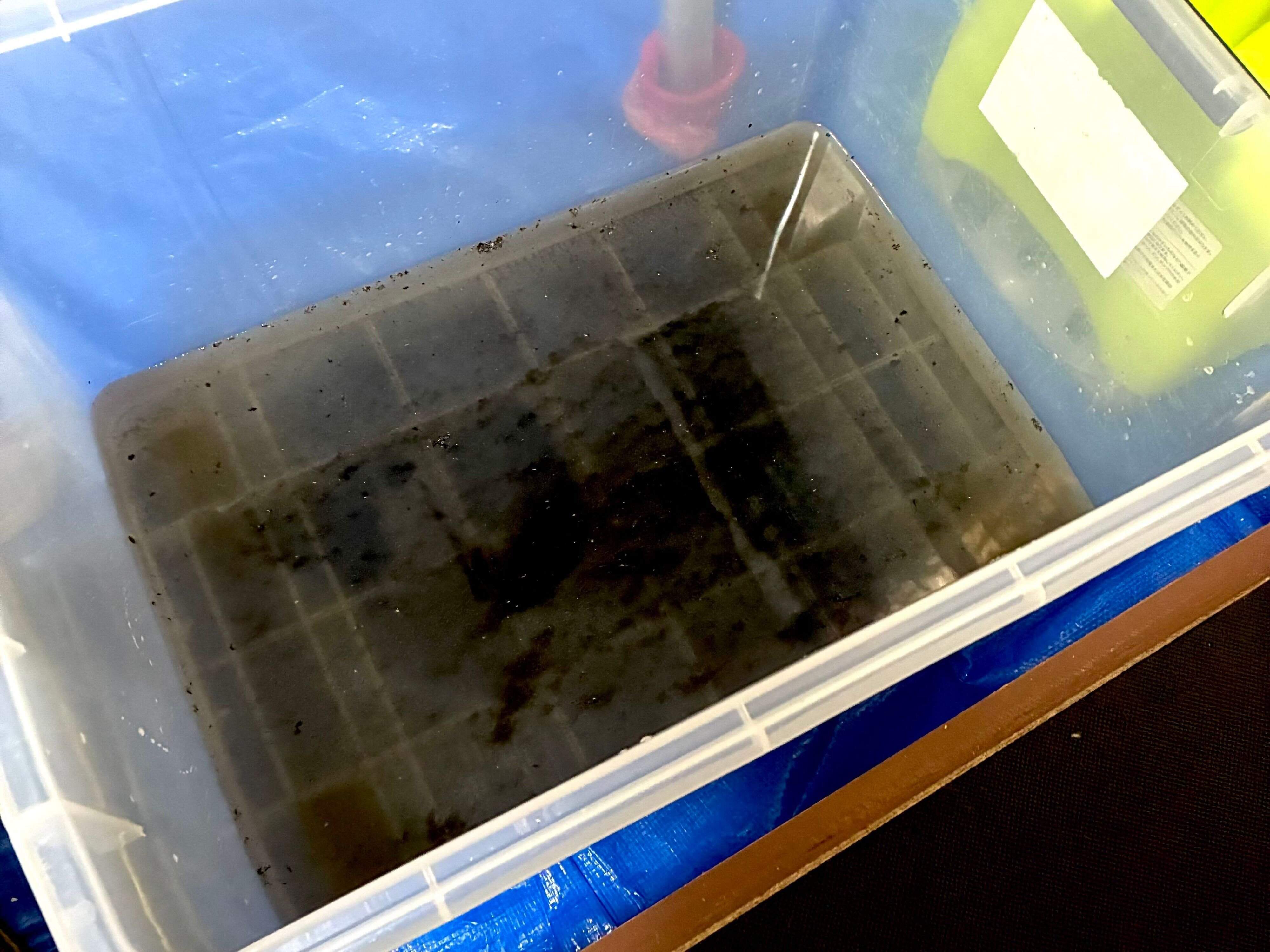 クリーニングの際、7年間放置したエアコンから出た汚れを見せてもらいました。真っ黒な液体から、相当な汚れが蓄積していたことがわかります。今回依頼した業者のかたも「もう少しこまめにクリーニングした方がよさそうですね」とおっしゃっていました。