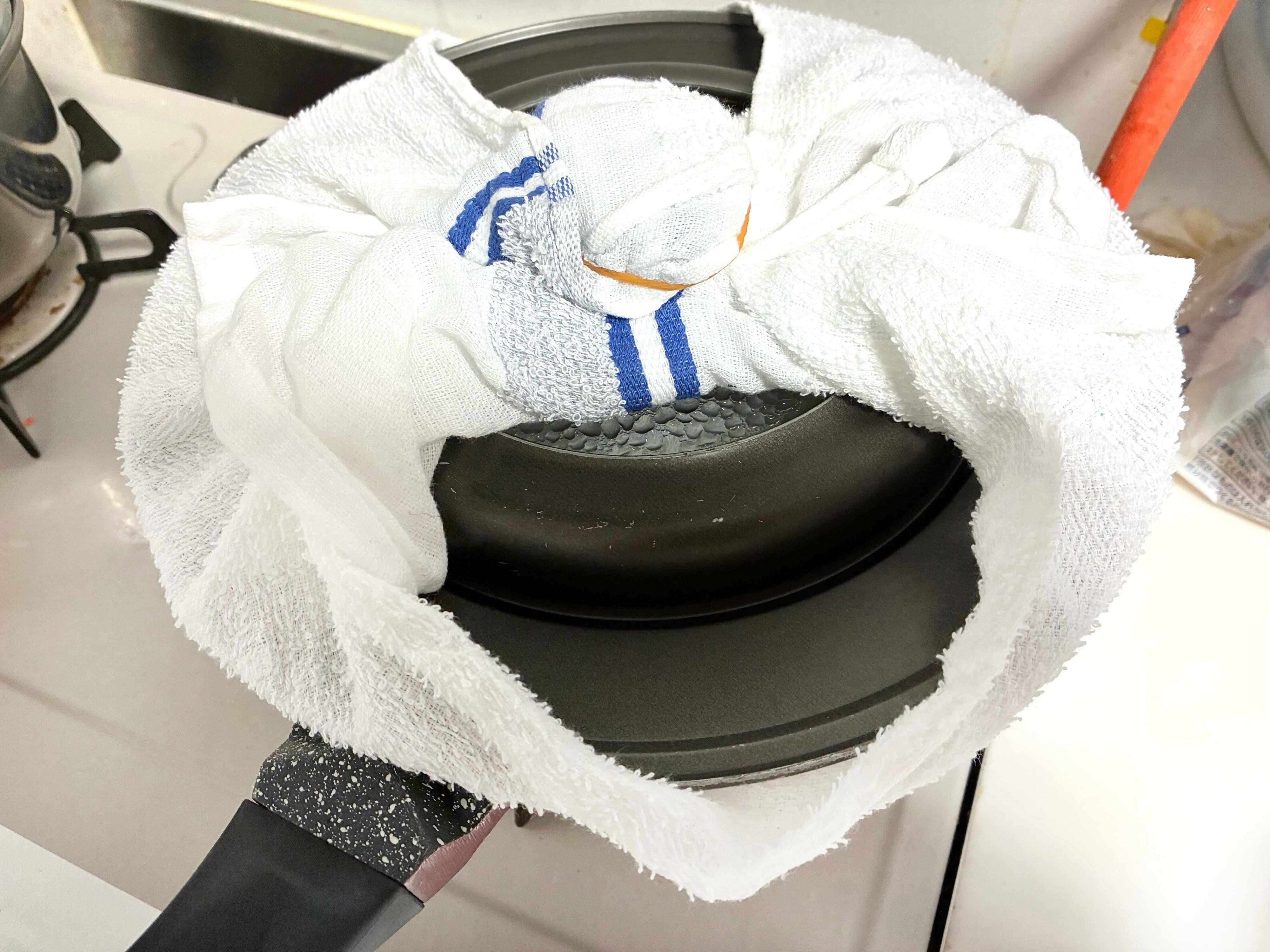 このとき、水滴(蒸し汁)が落ちるのを防ぐため、ふたにはタオルや手拭いを被せましょう。