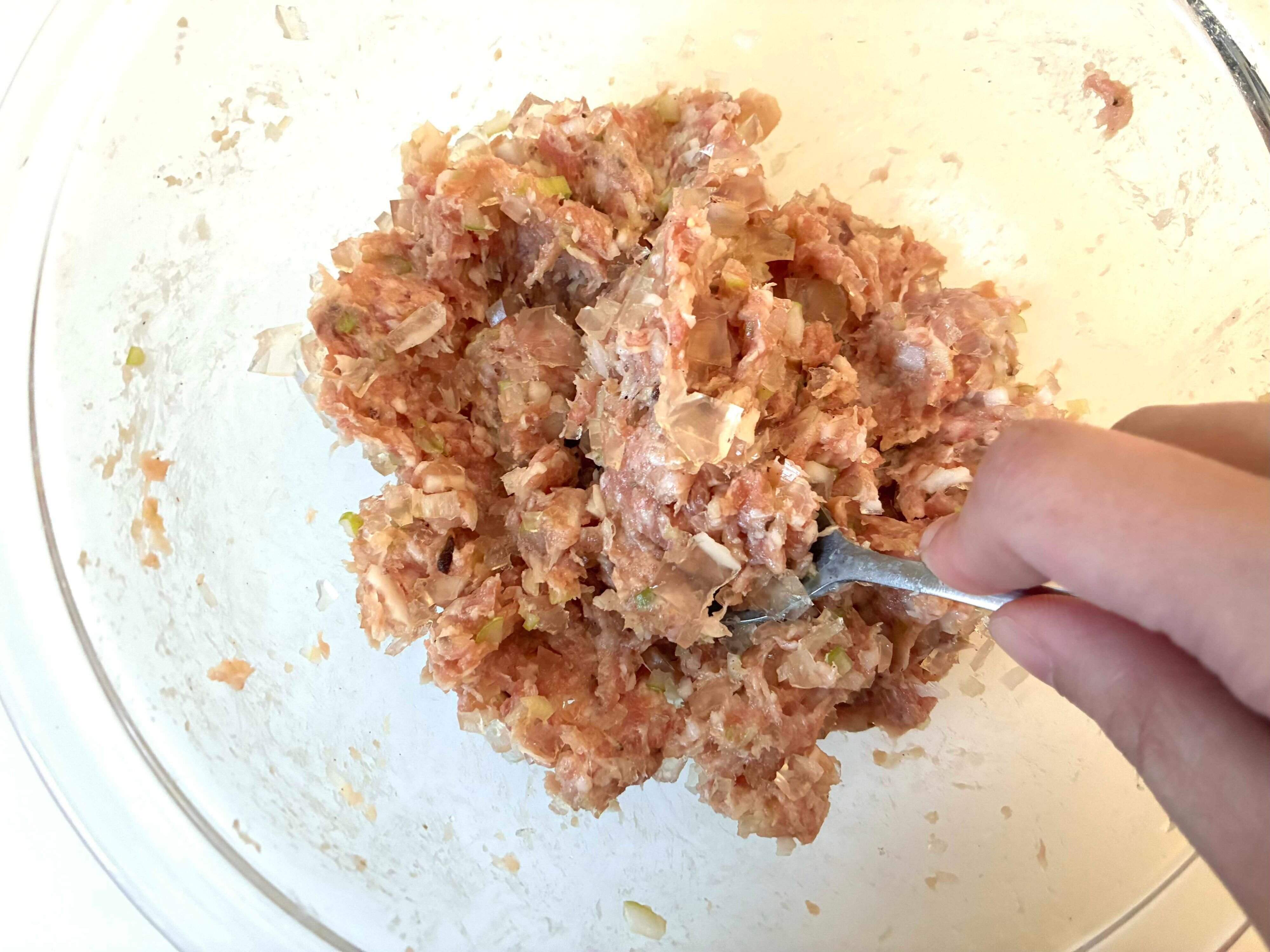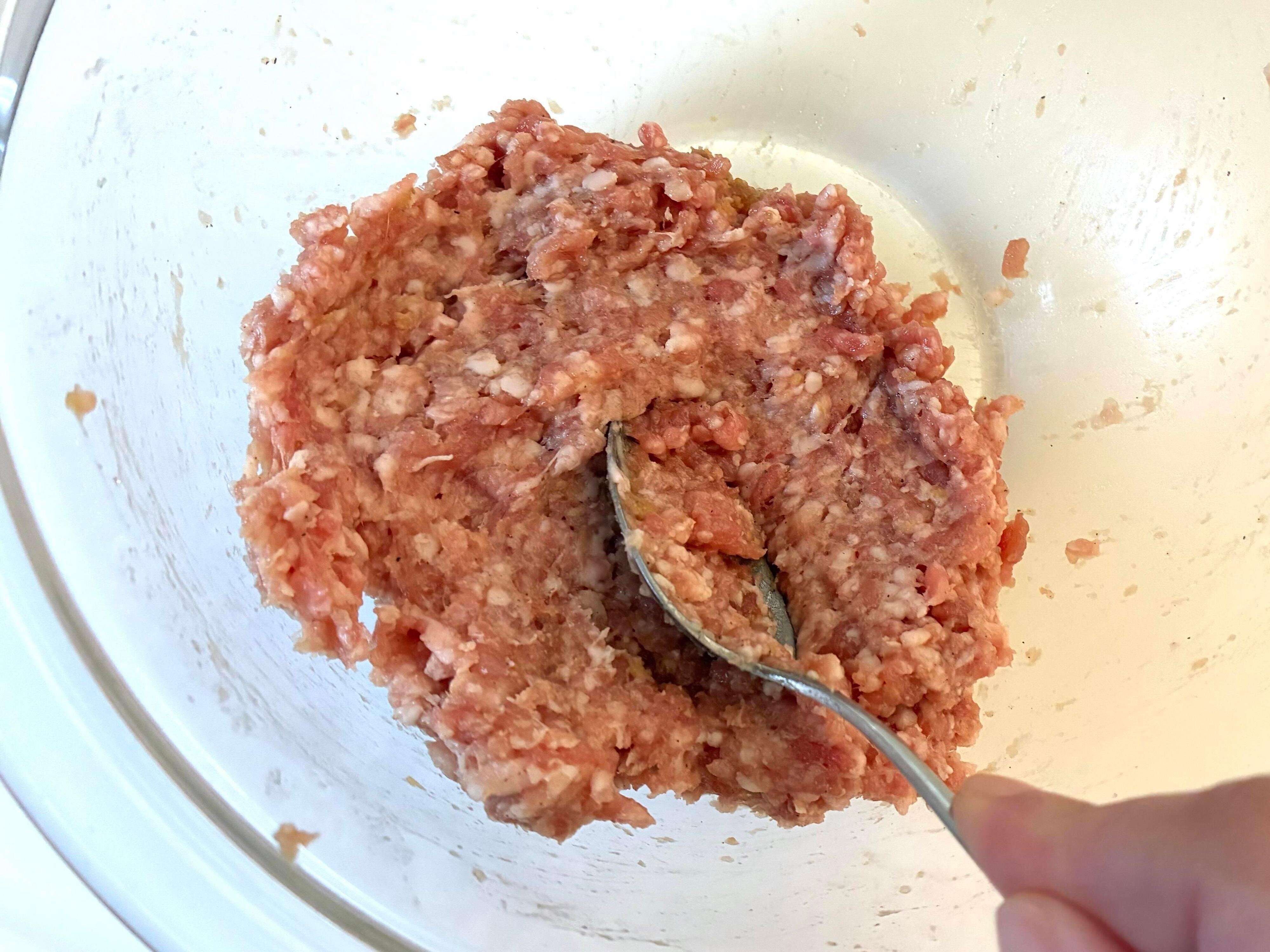 筆者は生肉を直接触るのが苦手なので、スプーンを使って混ぜています。スプーンを使っても、よくこねることで粘りが出ます。混ぜた後は冷蔵庫で冷やして肉だねを休ませましょう。