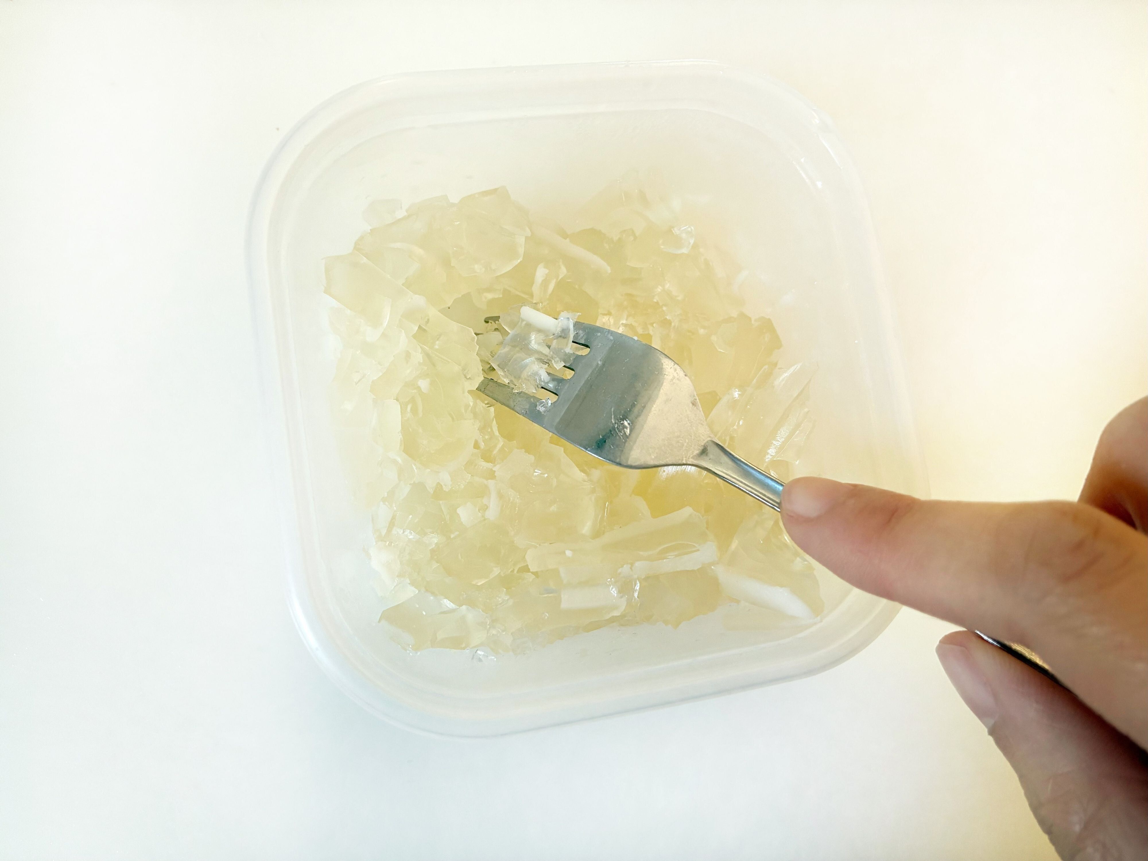 小籠包の中から出てくる肉汁スープの正体って、ゼラチンで固められた中華スープだったんですね。このとき、できるだけ細かく砕いておくと、後で肉だねに混ぜ込みやすくなりますよ。