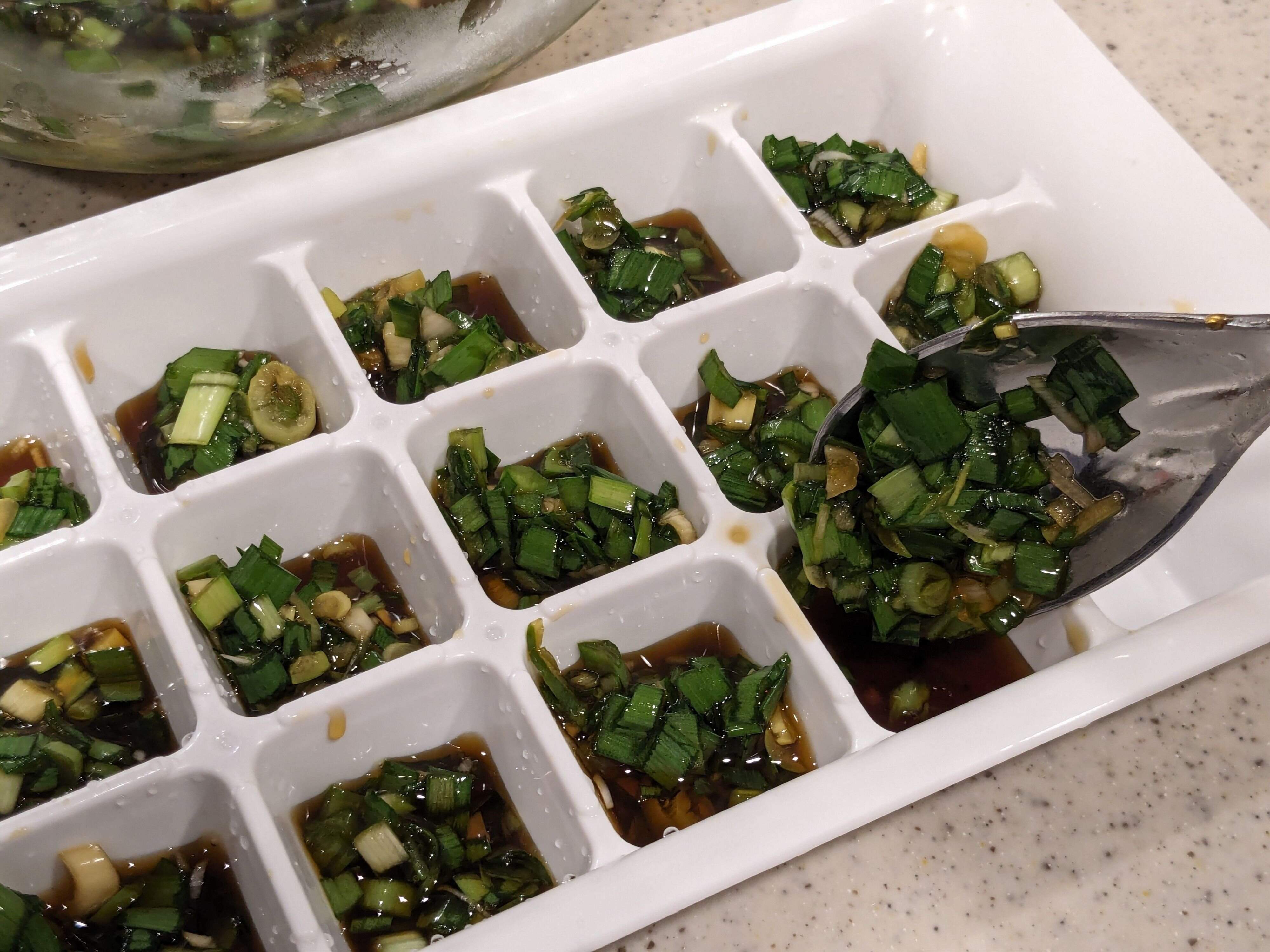 4.薬味から旨味を含んだ水分が出てきたら軽く混ぜてアイストレイなどに入れて冷凍する。