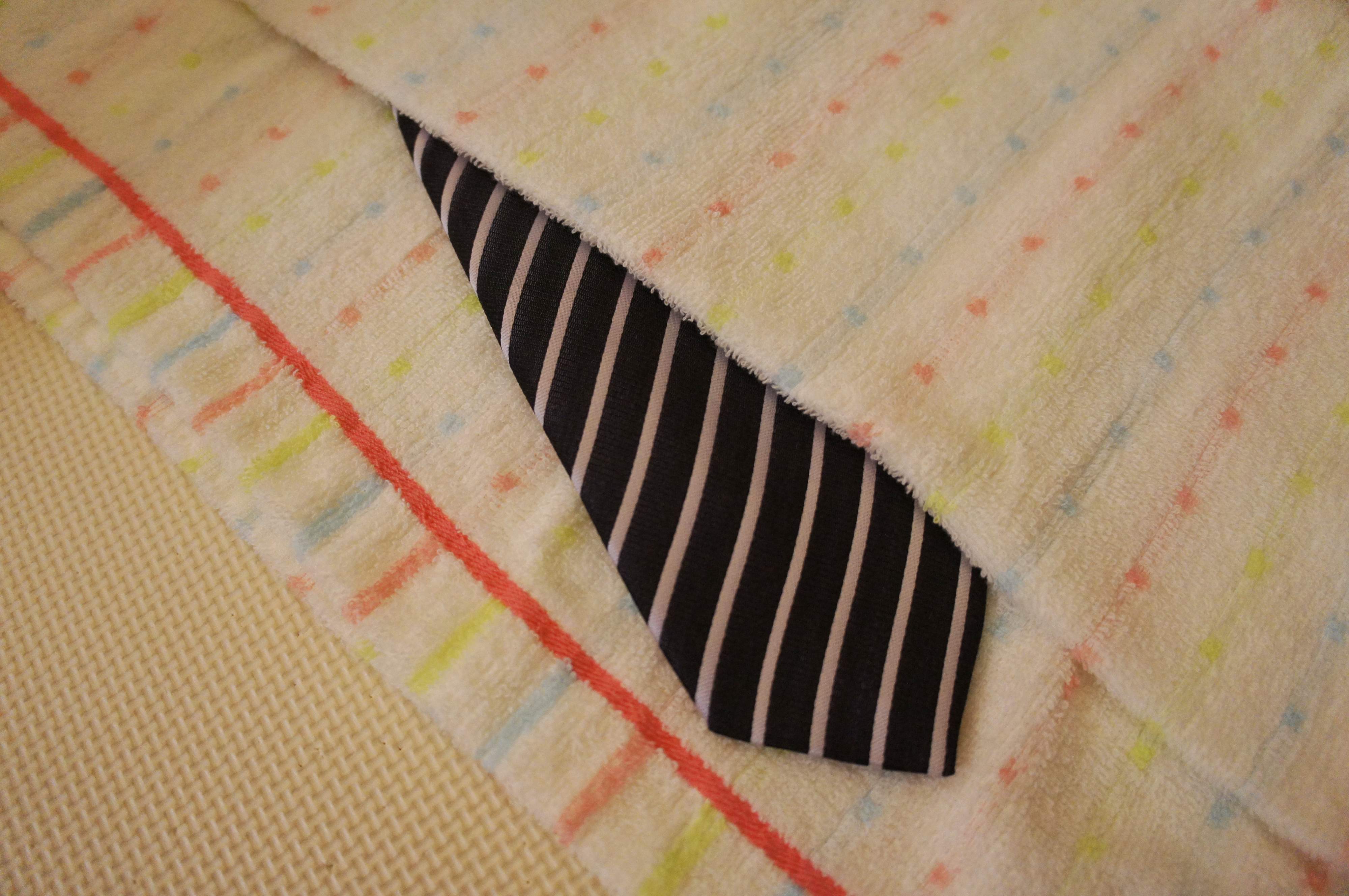 水を2回替えてすすいだら、バスタオルの中にネクタイを挟み、上からやさしく押して水気を取ります。ある程度水気が取れたら、ハンガーにかけて陰干しを。