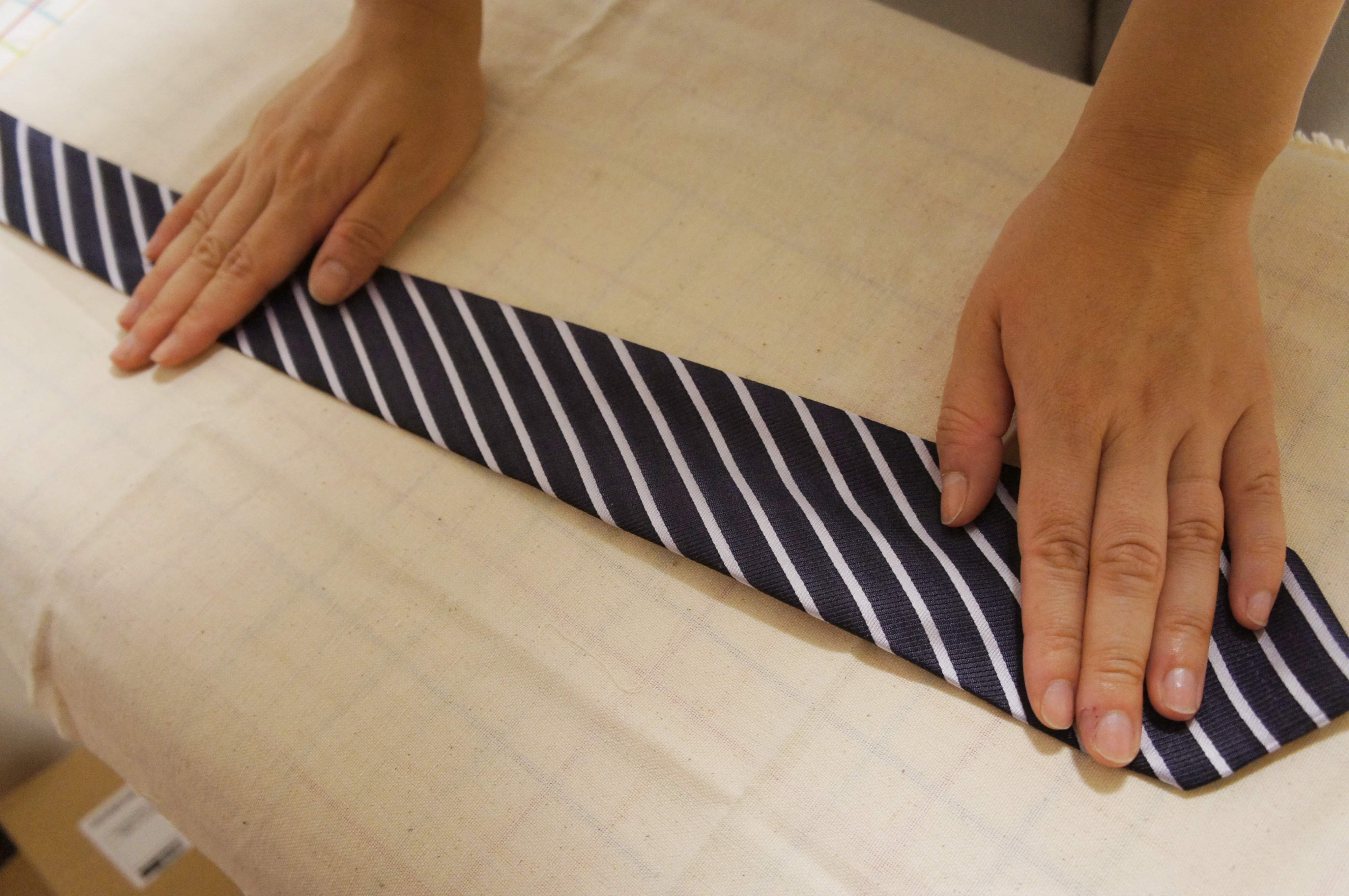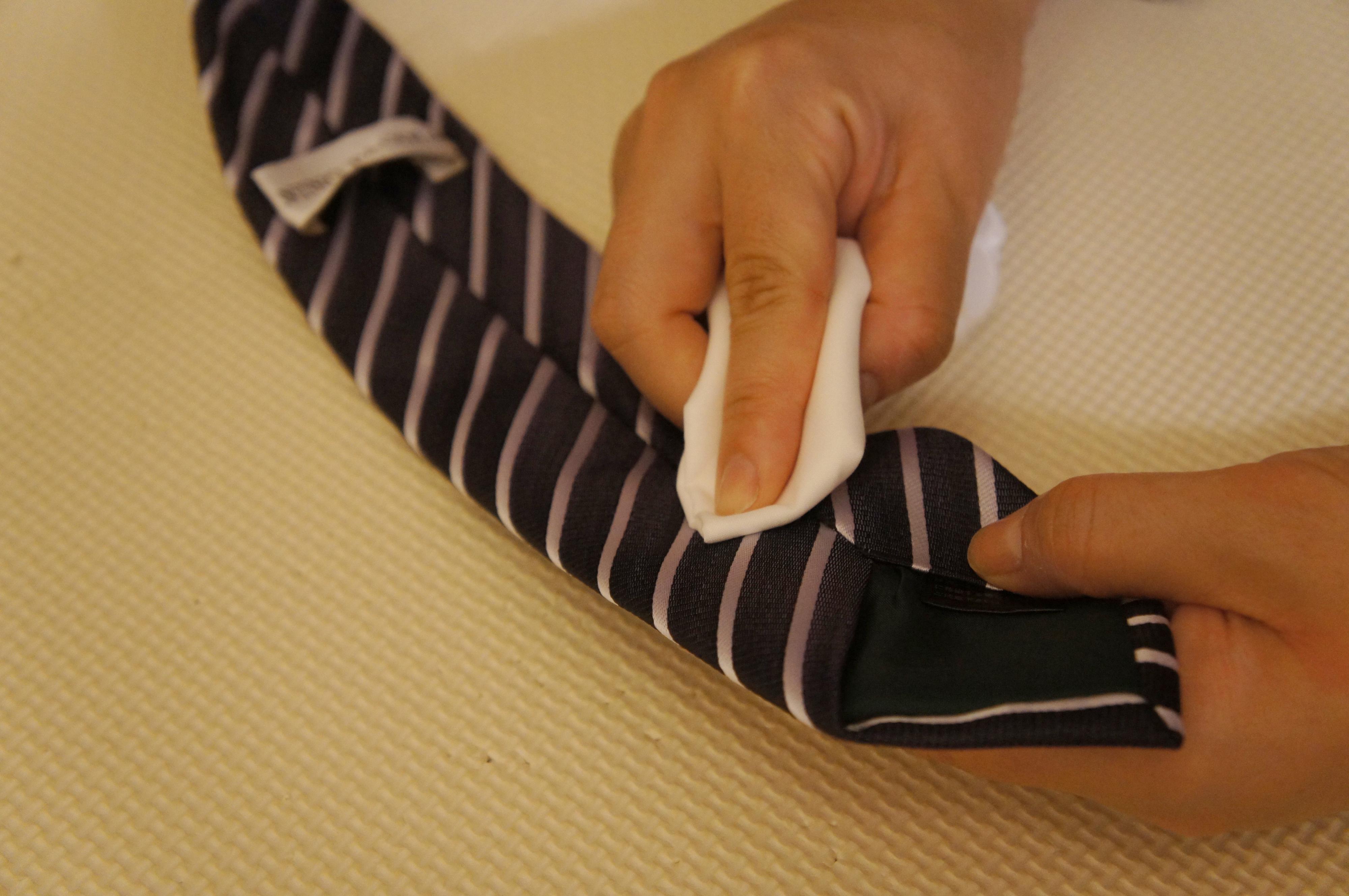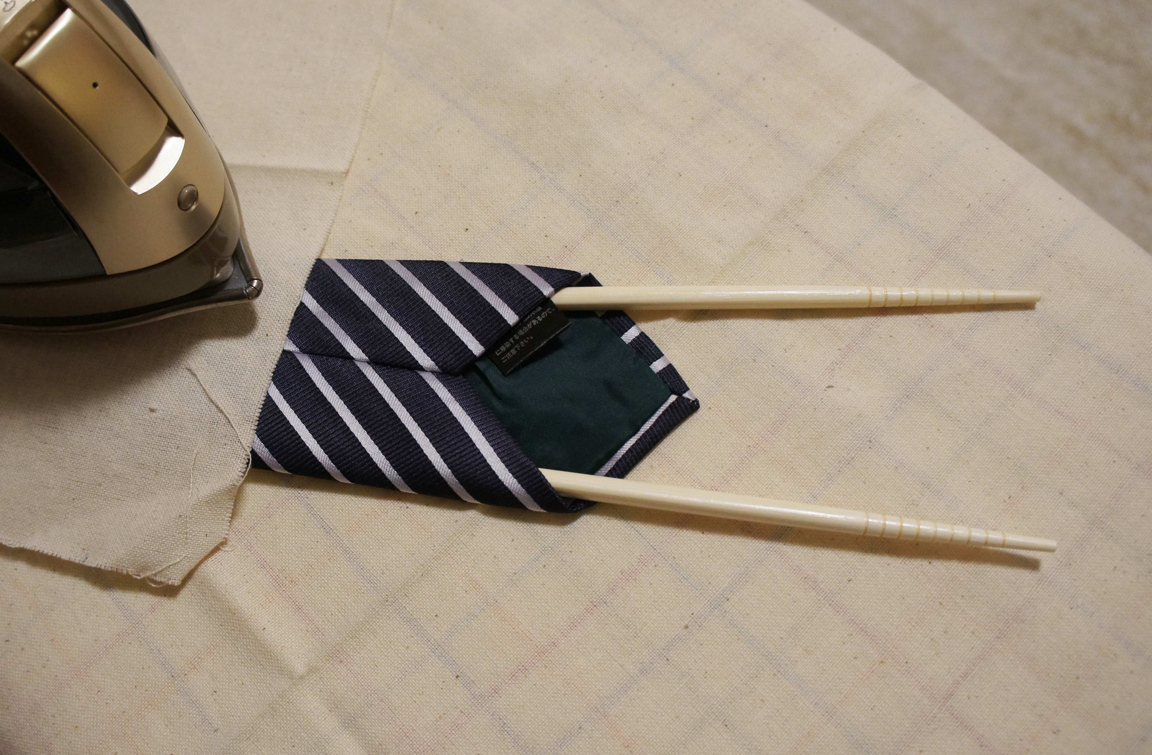 さい箸を折り目部分に差し込み、あて布をしながら再びスチームで浮かしがけします。全体にあてたらあて布をはずし、ネクタイの形を整っているか確認を。