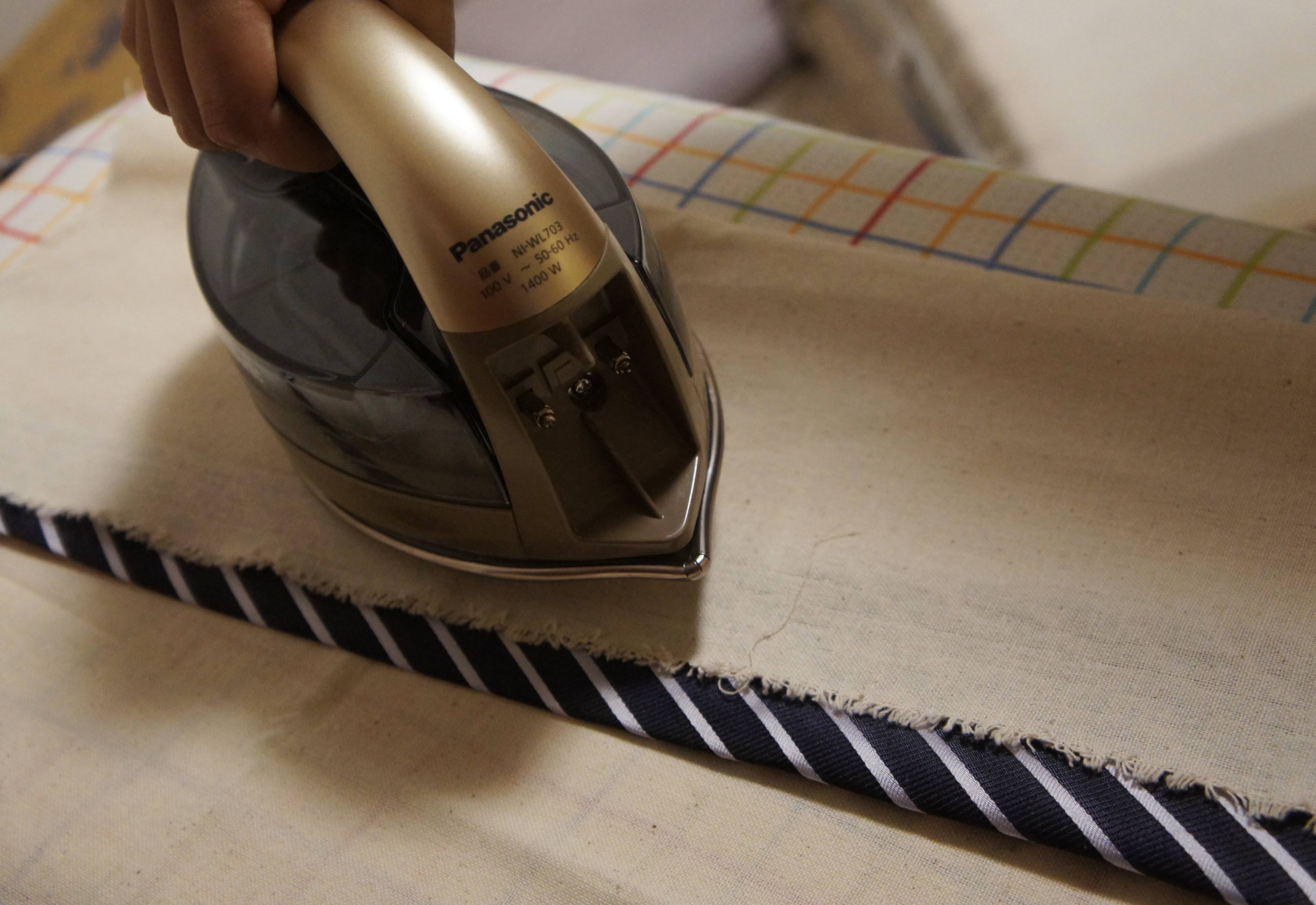 気になるシワを手でのばし、あて布をします。直接プレスするとネクタイがぺたんこになってしまうので、アイロンを1cmほど浮かせた状態でスチームをあてるようにしましょう。