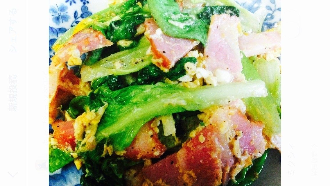 ゆきっちさんの、マヨネーズを活用した時短レシピ。作り方は、ベーコン・サラダ菜・卵をマヨネーズで炒め、塩コショウで味を整えるだけ。マヨネーズは油代わりにもなり、それだけで味付けもできる便利な調味料です。簡単にコクのある炒め物が完成しちゃいます♪