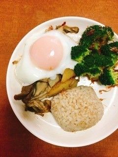あづまゆきえさんのこの日のおひとりランチは、昨日の残り物の牛肉の炒め物に舞茸とじゃがいもをプラスしたもの。ブロッコリーと目玉焼きを添えてご飯も玄米にするなど、見た目と栄養バランスにもこだわっています。