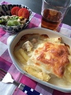 かなぴすたさんのこの日のメニューは、マカロニグラタンとスナップエンドウのサラダ。残り物でもバランスよく、見た目にもうれしいランチになっています。
