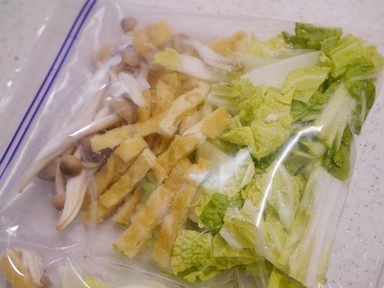 ブロガーのみい太さんは、しめじと油揚げ、ざく切りにした白菜を合わせ、1回分ずつジップロックで冷凍保存しています。使うときはそのまま鍋に入れて煮るだけで、簡単にお味噌汁や煮びたしが完成!冷凍することで、野菜の細胞が壊れて火が通りやすく、味も染みやすくなるそうで、料理の時短にもつながります。