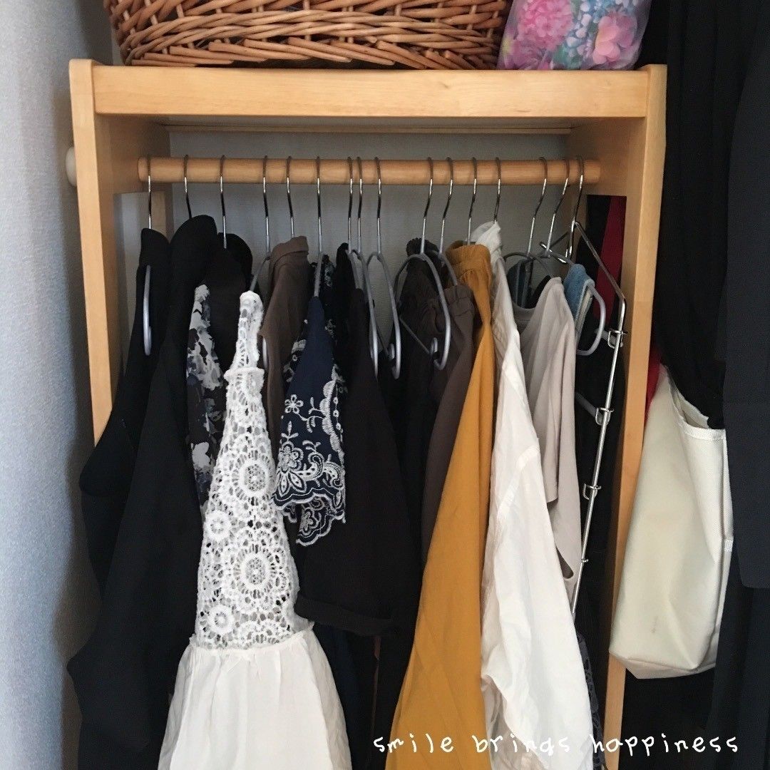 ゆみっぺさんも、型崩れしやすい服や部屋着・インナー以外は、ハンガーにかけて収納しています。洗濯物が乾いたら、そのままかけるだけなので楽ちん。服を見つけやすい、シワになりにくい、よく着る服・不要な服を仕分けやすいなどのメリットもあったそう。ハンガーを統一すると、見た目もスッキリまとまりますよ。