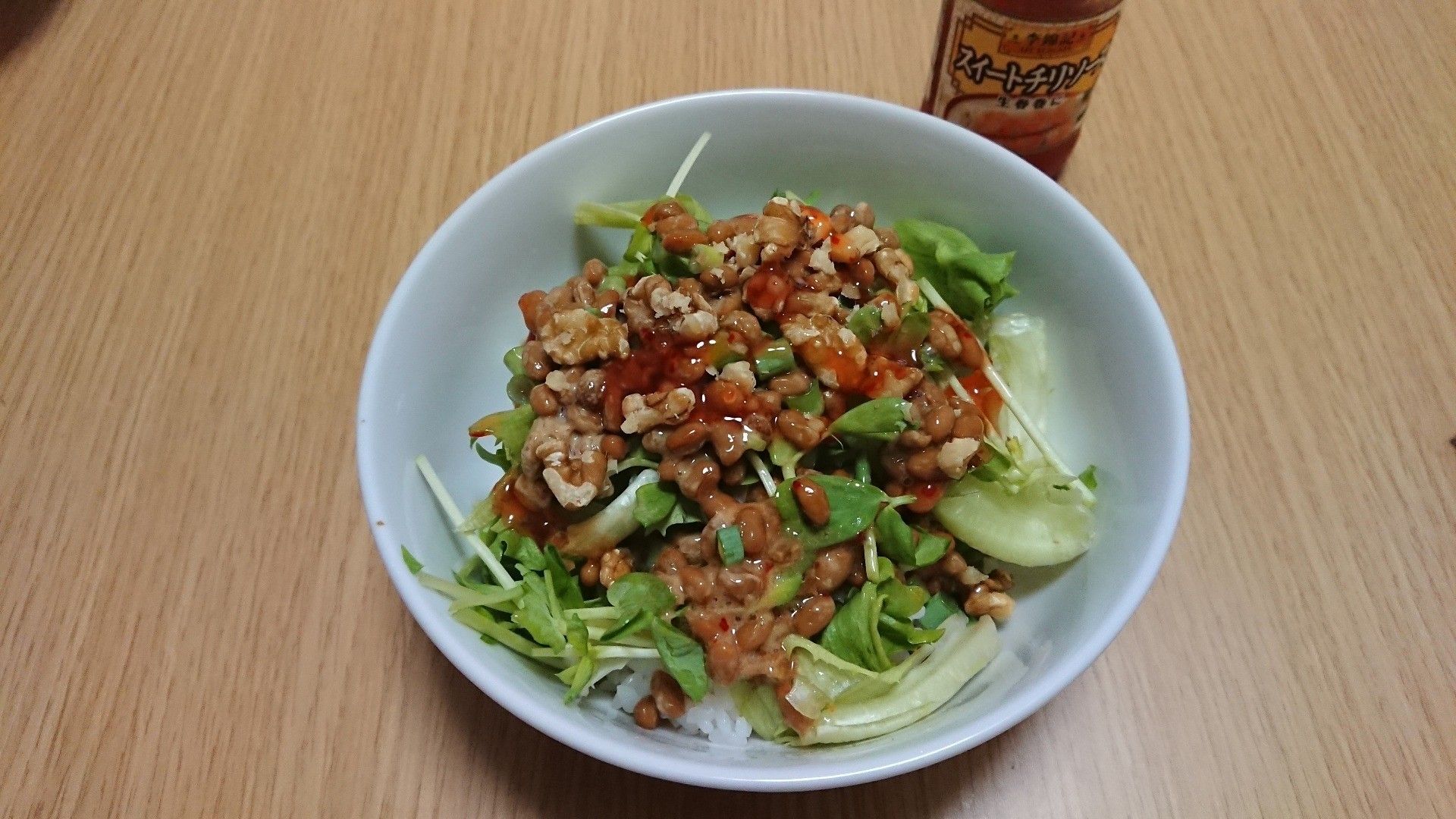 【子ども1人】パパッとのっけ丼!納豆×レタス×生クルミ×スイートチリソースで栄養◎