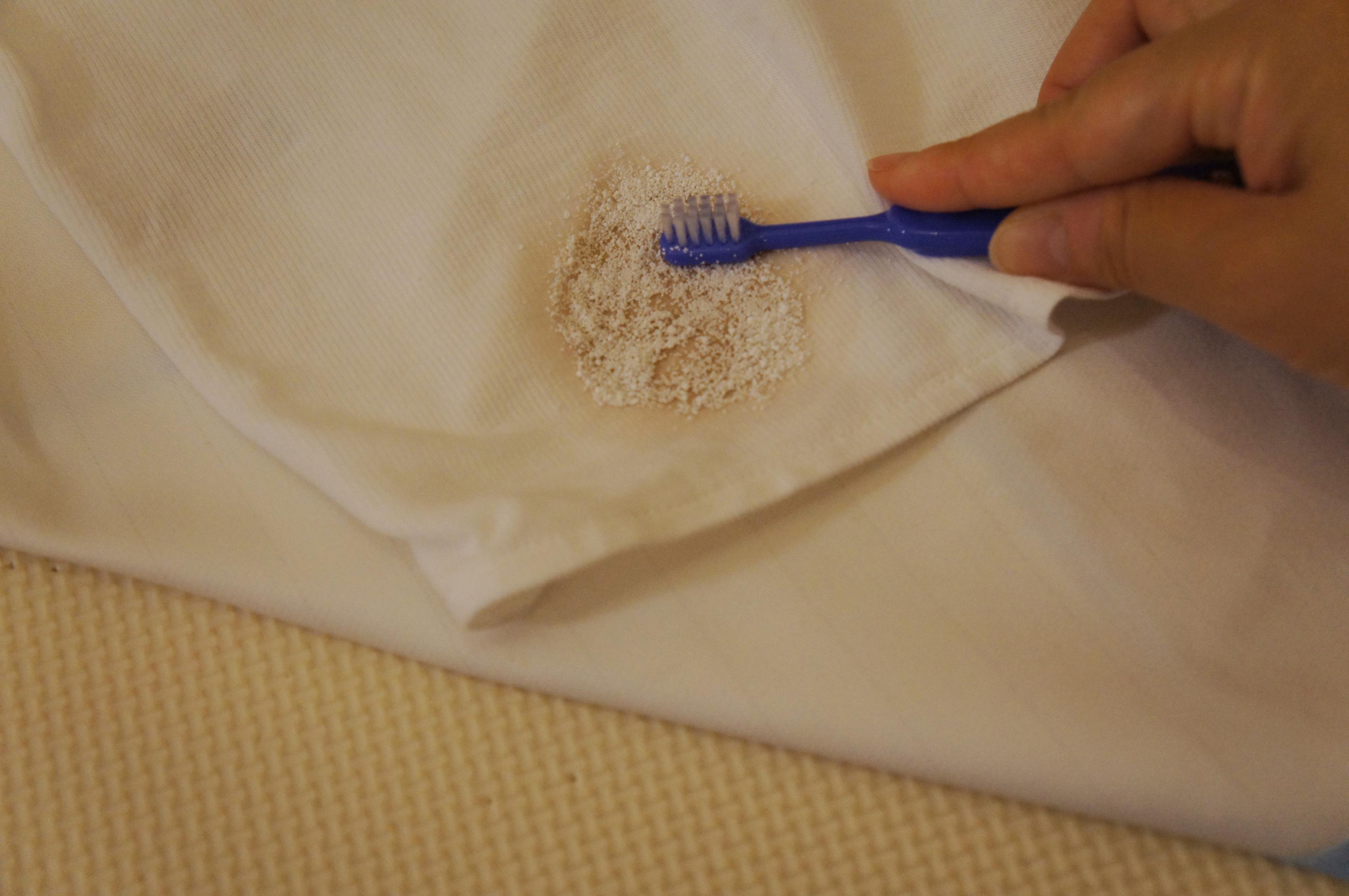 あて布をして、1の漂白剤&重曹をシミ部分に塗ってなじませ、しばらく置きます。