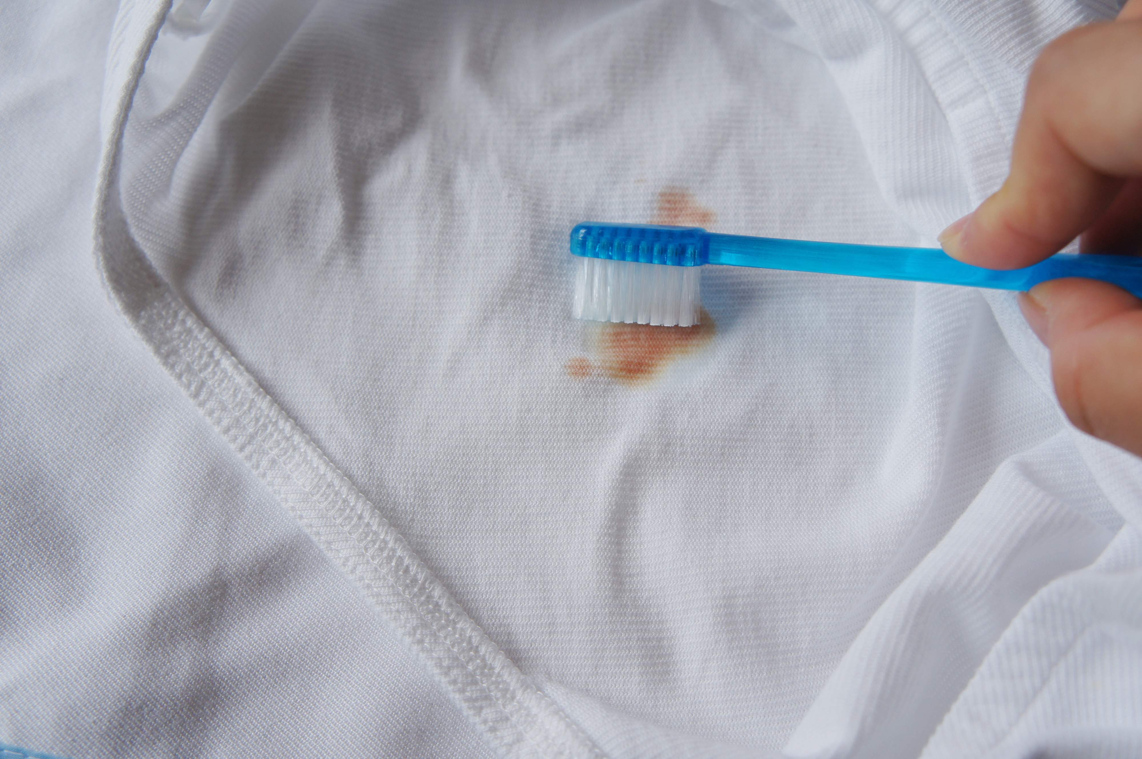 シミが残ってしまう場合は、台所用洗剤をつけた歯ブラシでたたきます。