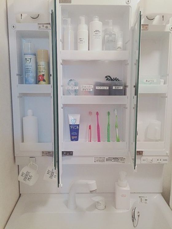 3面鏡内部の棚に、歯ブラシ、基礎化粧品、小物類と、種類ごとに分けて収納しているMIYUさん。コンタクトやシェーバーなど小物類のケースは、ラベルを貼って中身を分かりやすくしています。コップはぶら下げると、お掃除もしやすくスッキリ!蛇口の横に置いたメラミンスポンジで毎日さっと掃除して、清潔な洗面台を保っています。