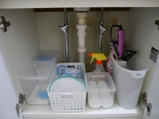 使用頻度によって収納場所を分けている田中千恵さん。普段使わないヘアアイロンや洗剤などは、セリアのケースに入れて洗面台下に。かわいい容器に詰め替えた洗濯洗剤やドライヤーなど、毎日使用するものはすぐに取り出せるラックに。さらに、ゴム手袋やスポンジは洗面台横の隙間に吊るすことで、スッキリと使いやすい洗面所になっています。
