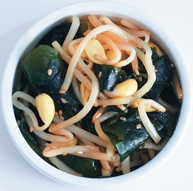 1. わかめ(乾燥)2gはたっぷりの水でもどす。豆もやし1/4袋は耐熱のボウルに入れ、ふんわりとラップを掛けて、電子レンジで1分加熱する。