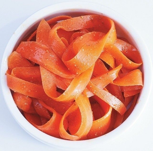 1. にんじん1/4本は、ピーラーでリボン状にする。耐熱のボウルに入れ、ふんわりとラップを掛けて、電子レンジで1分加熱する。