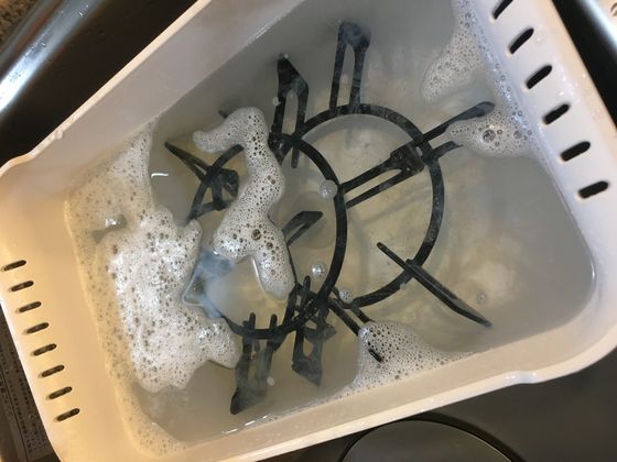 コンロの五徳を重曹水にまるごと漬け置き!