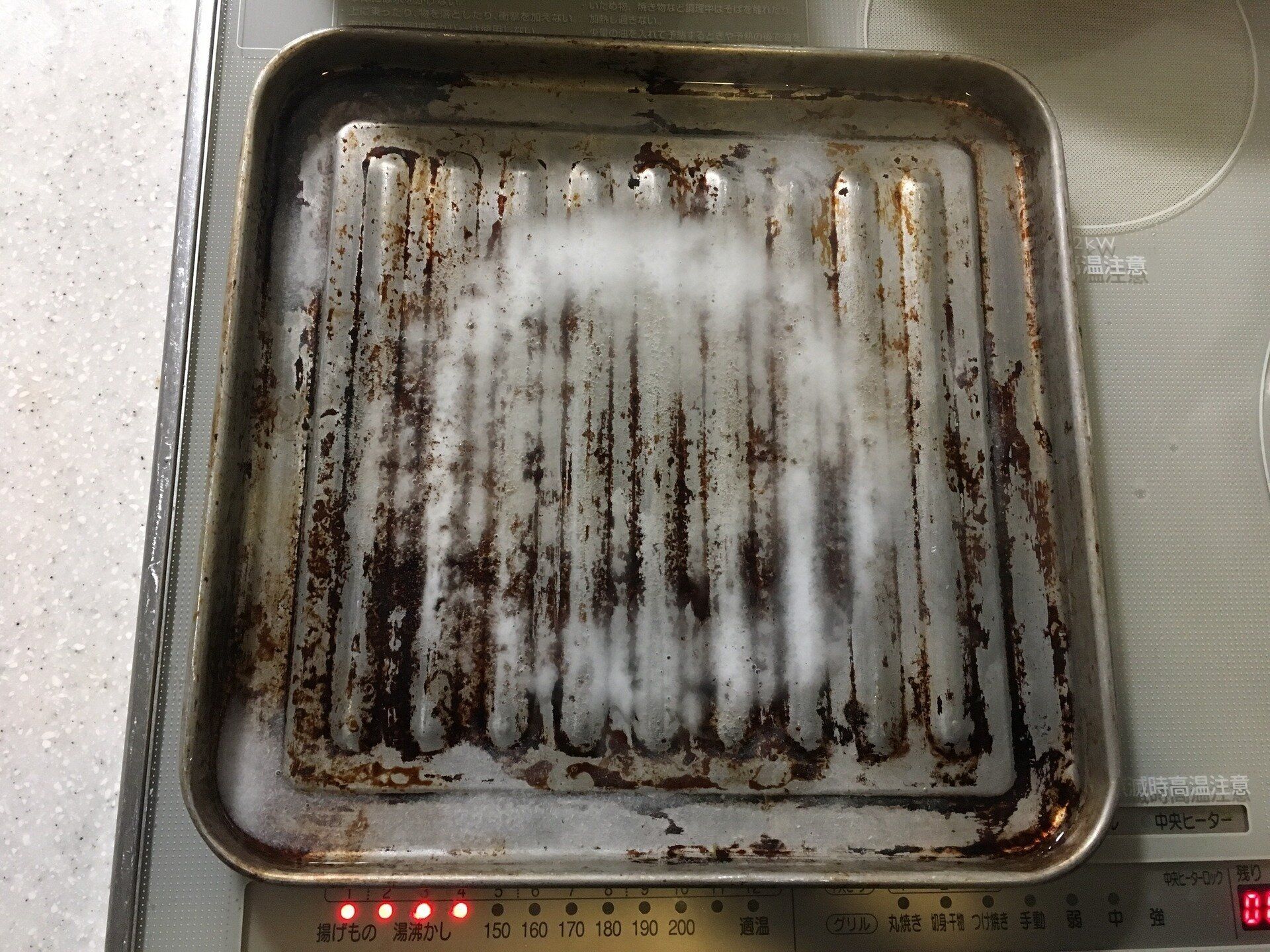 焦げと油がこびりついたこんなトースタートレーも、セスキ炭酸ソーダ水を入れて加熱するだけで簡単キレイに!加熱に関しは、安全と品質表示などを考慮して行いましょう。