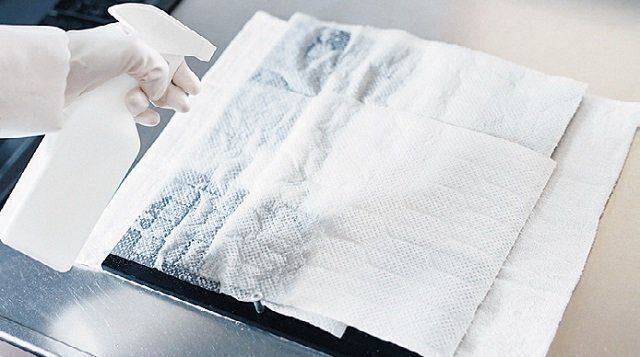 古タオルを敷き、フィルターを置いてペーパータオルをのせ、アルカリ電解水をかけて5分ほどおく。