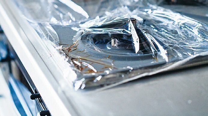 コンロの油汚れは、アルカリ電解水をかけてラップを貼る。ドライヤーの温風を1~2分当てて、こびりついた汚れをゆるめる。
