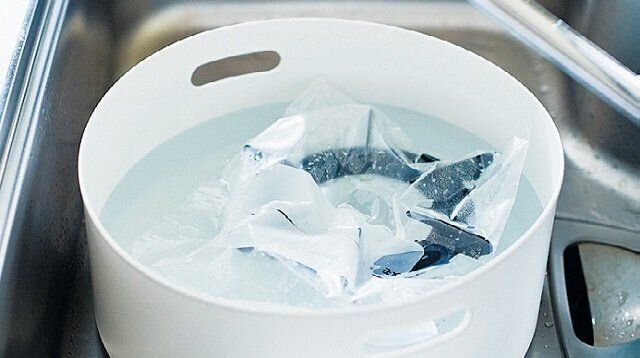 ポリ袋ごと40~50℃の湯に10分ほどつけたら、水で洗い流す。汚れが残っていればカードやスポンジでこすり洗いし、水で流してから拭きする。