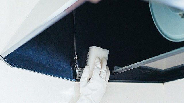 フードカバーは、アルカリ電解水を含ませたスポンジでこする。湯でぬらした古タオルで汚れを拭き取ってから、別の古タオルでから拭きする。