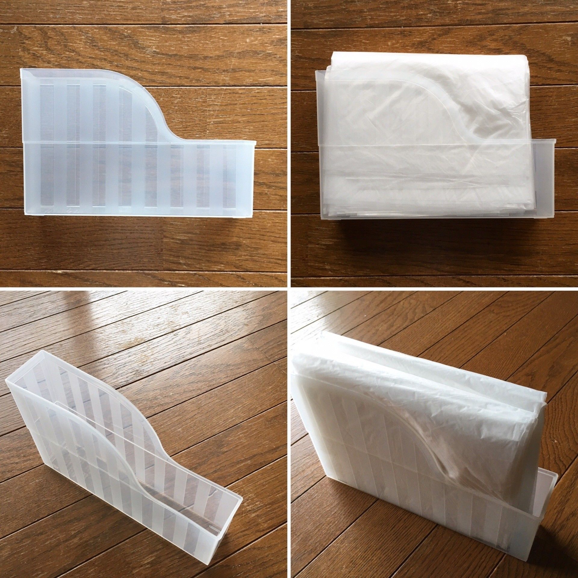 レジ袋は三角折りにしたり、そのままクルクルっと結んだり、保管方法は人それぞれ。でも四角折りにいておくことで、スッキリと自立しますし、サイズも一目瞭然。使いたいサイズが一目でわかるのが魅力です。