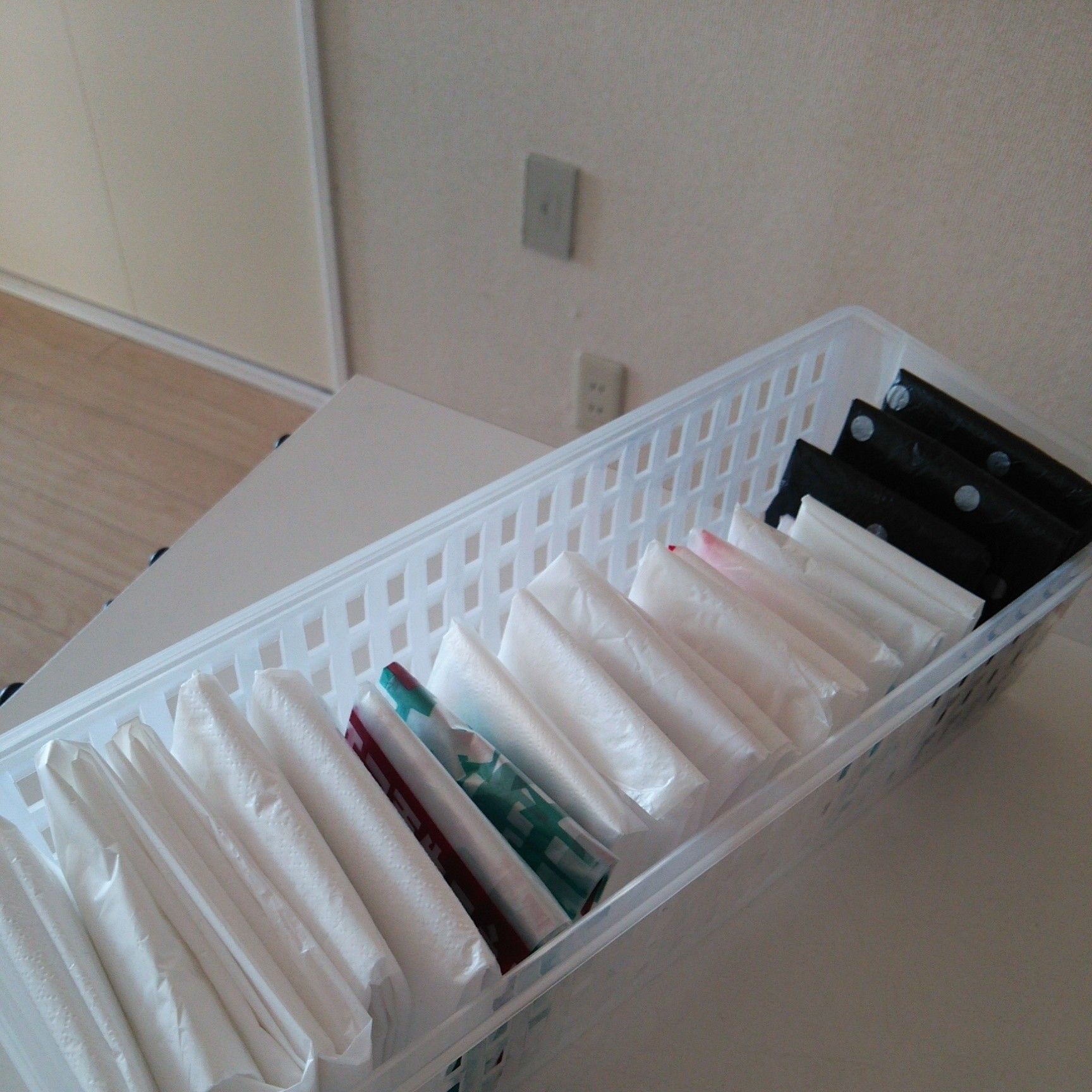 サクッとキレイに収納するには、やはり専用のケースで揃えるほうが見栄えもよくなります。燃えるごみ、燃えないゴミ袋、オムツや生ごみ用のビニール袋を、ネット通販で購入した「キッチン消耗品ケース ホワイト」に入れています。ラベリングもされていてわかりやすいですね。