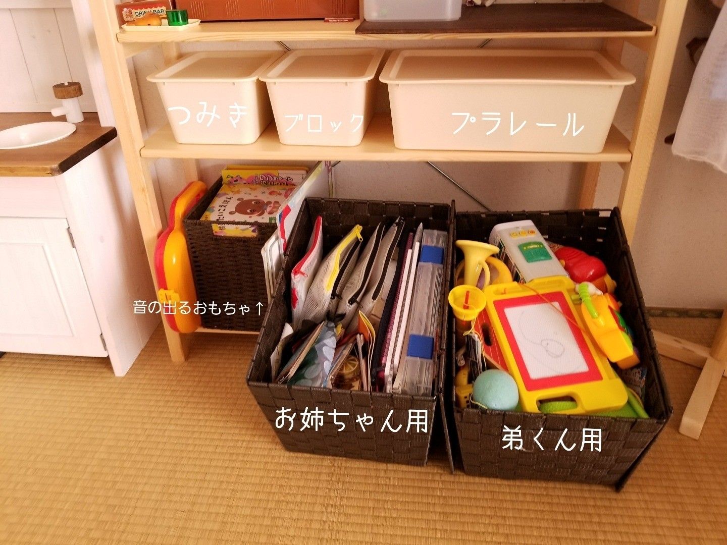 子どものおもちゃは寝る前やお出かけ前などにリセットするというmaorinさん。子どもたちが簡単に片付けられるよう、プラレールや積み木などは種類別の箱へ、そのほかの区分しにくいものは子ども別の箱にぽいぽい収納。箱に収まる分だけをもつようにすることで、見た目もスッキリと保っています。