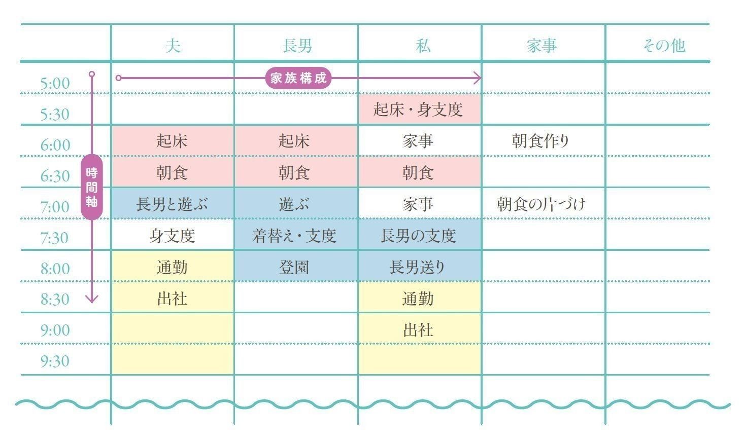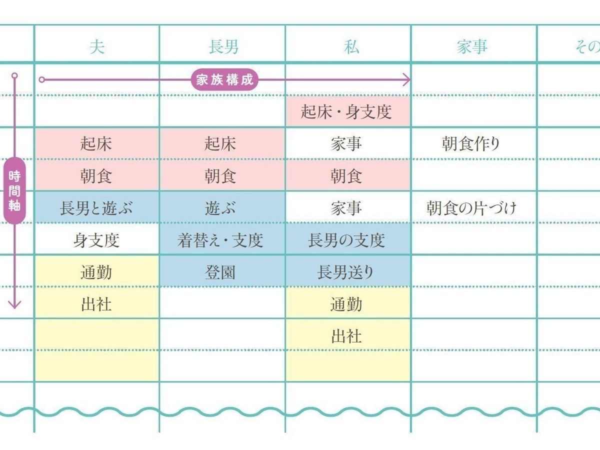 縦軸と横軸を記入したら、あとは「だれが」「いつ」「何を」しているかを書くだけ。「毎日ルーティンにしている時間づかい」をベースに「理想の時間づかい」を記入していきます。時間ごとに家族の行動を書いたら色分け。起床や就寝、食事などの「生活の時間」はピンク、勤務中などの「仕事の時間」は黄色、保育園の送迎やお世話など「子どもとの時間」は青など、色分けをすると、どんな時間を過ごしているか一目瞭然に