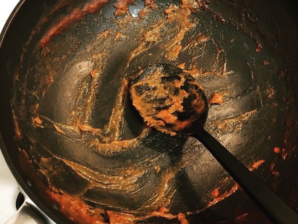 自分なりの洗い方でテンションを上げているナカムラマリコさんは、水を張った鍋を沸騰させ、まわりについたカレーをカリカリに。それをシリコン製のおたまで回し取り、全体的に混ぜて汚れを剥がします。カリカリの状態だと、汚れがキレイに剥がせて気持ちがいいそうです。あとはお湯を流してふつうに洗うだけ。スポンジも染まらずラクに掃除ができます。