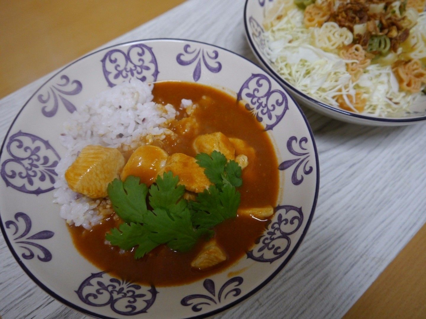 家族の帰宅時間がせまり、急いで夕飯を作らなければいけないとき、田中千恵さんが試してみたのが、業務スーパーのバターチキンカレーの素。鶏肉を炒めて、ペーストを加えて煮るだけの高速メニューです。これにマカロニ&キャベツのサラダをプラスして、夕飯の出来上がり!値段も手ごろで味もおいしく、夫にも好評のようでした♪