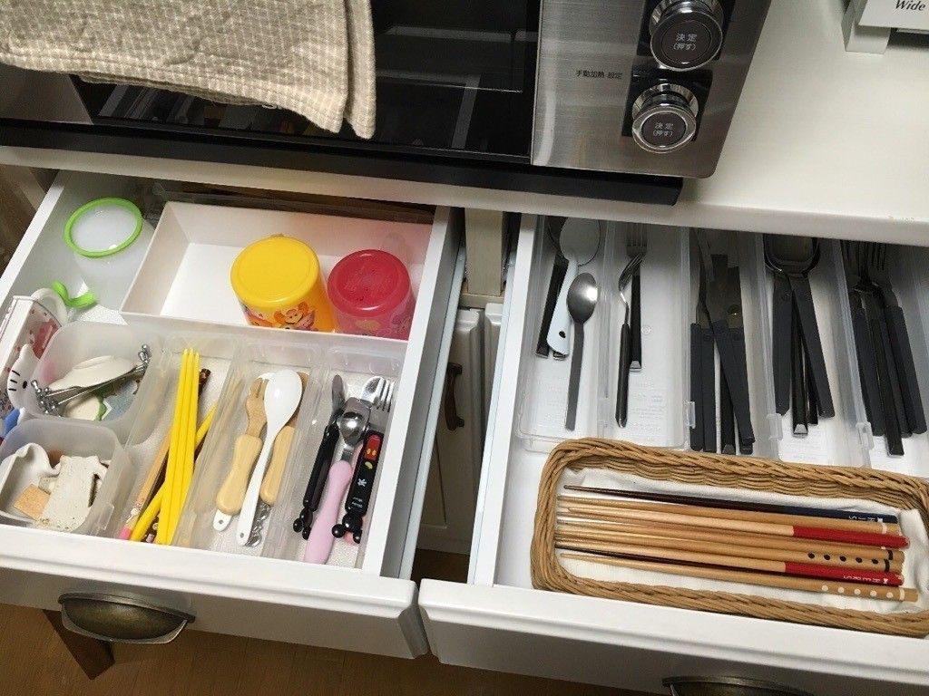 Hitomiさんは食器棚の2つの引き出しの右側を大人用、左側を子ども用とわけてカトラリーを収納しています。どちらもセリアのジョイントできるケースを使用して、横に5つ並べた大人用の引き出しは見事シンデレラフィット!子ども用の引き出しも分かりやすく整理されているので、自分でカトラリーやコップ類を準備できるそうですよ。